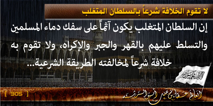 2/ (السلطان للأمة) أي أن السلطان في أساسه مستمد من الأمة، فالأمة تبايع بكامل إرادتها خليفة راشداً تتوفر فيه شروط الأهلية لتولي الحكم كما بينها الإسلام العظيم، وهذه ضمانة قوية تجعل الحكم مستقراً راسخاً، فإن قوة الخليفة والخلافة تكمن في سندها السياسي الحقيقي؛ أي الأمة العظيمة، وهذا نقيض كل الأنظمة الديكتاتورية ذات الوجه الديمقراطي المزيف في بلاد المسلمين.