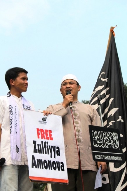 نظم حزب التحرير / إندونيسيا فعاليات نصرة للأسيرة زولفيا أمانوفا التي اختطفها جلاوزة النظام القيرغيزي وأودعوها في غياهب السجون لمطالبتها الكشف عن ملابسات مقتل والدها في سجنه الذي كان يقبع فيه منذ 14 سنة.