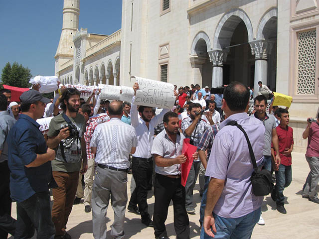Hizb ut Tahrir / Wilayah Turkey members and supporters protested outside the Sabanga Mosque in Adana after Friday prayers. They raised banners condemning the killing of unarmed Muslims in Egypt, Syria, Palestine, Iraq, Afghanistan and other Muslim countries. A prayer for the dead Muslims in Egypt and the Levant was performed.
