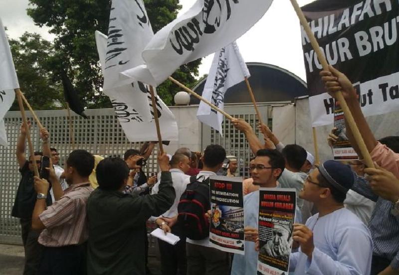 KUALA LUMPUR 11 11 November - About 50 of Hizb ut-Tahrir Malaysia (HTM)'s members and supporters gathered at the Russian Embassy today to voice out protest on the brutal act of the Russian regime towards the Muslims in Russia in general and the members of Hizb ut-Tahrir Russia in particular.