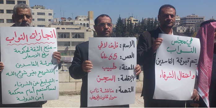 Hizb ut Tahrir/ Wilayah Jordan organized a stand before the Jordanian House of Representatives on TGuesday, March 25, 2014 to denounce the fact that the Jordanian security services arrested two members of Hizb ut Tahrir, which they are confined to the House of Representatives and transferred them to the State Security Court. They are Doctor Nayef Omar Lafi (65 years old) and Brother Ibrahim Mahmoud Kharabsheh (55 years) who were among a delegation comprising members of the Hizb. The delegation was communicating with members of the House of Representatives and handed them a statement issued by the Hizb; outlining the party's stance against a draft law amending the Prevention of Terrorism Act and warning them of it and calling to stop it being passed.