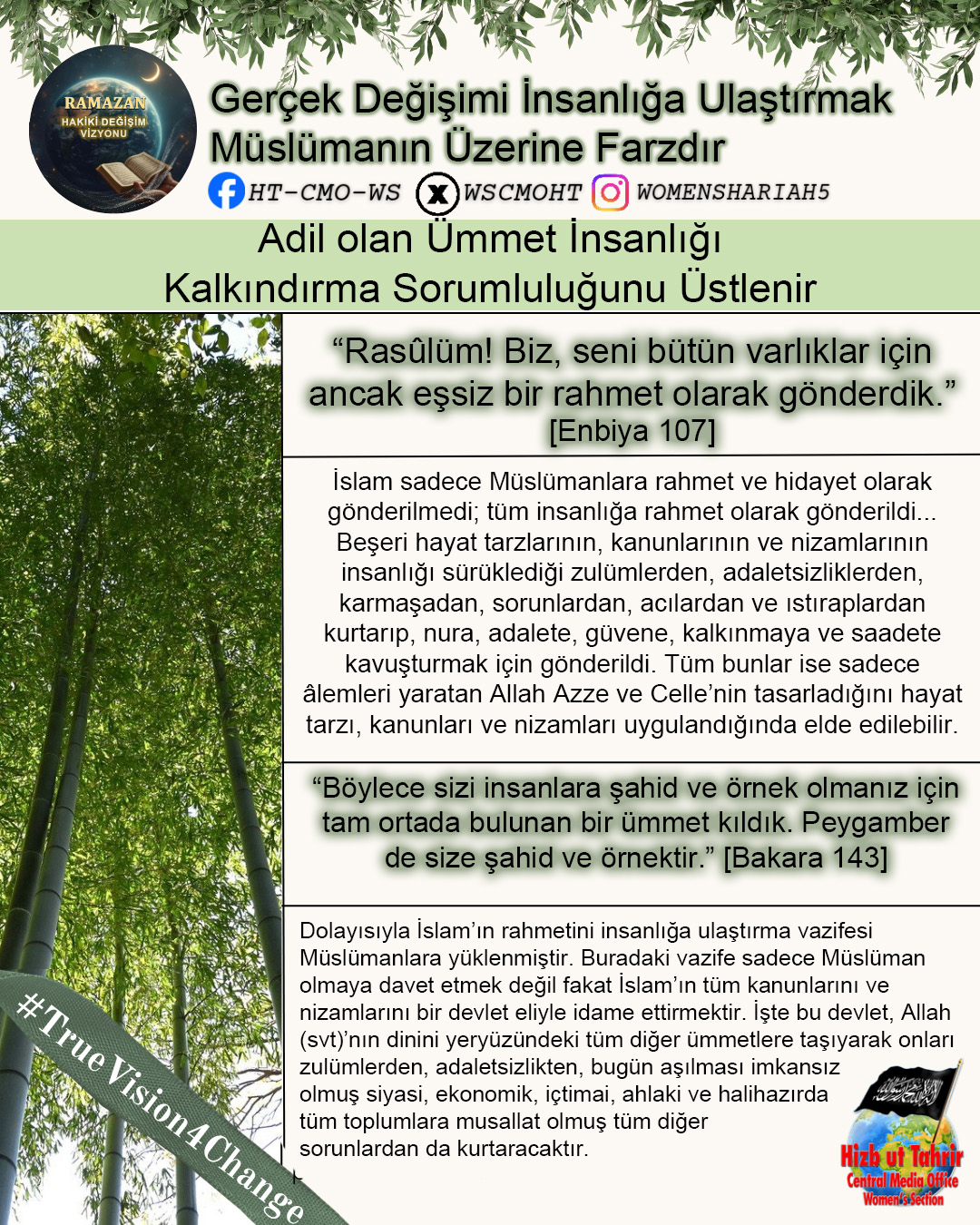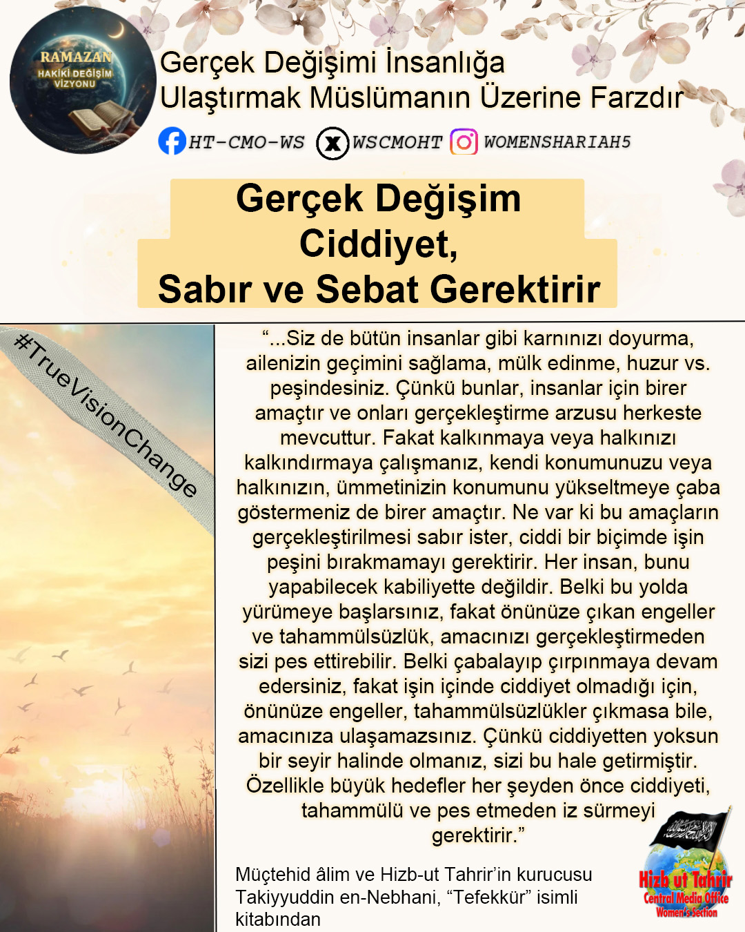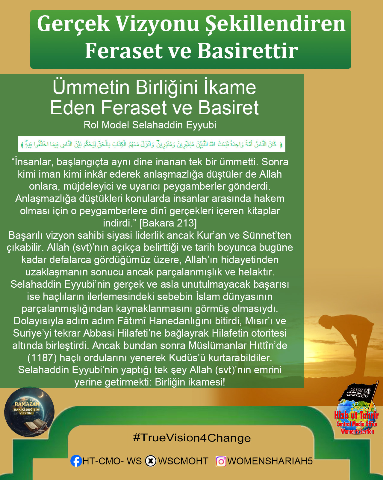 Ey Müslümanlar! Şüphesiz sizin izzetiniz, Raşidi Hilafet Devletinin geri dönüşünde saklıdır. Halkına asla yalan söylemeyen bir lider olan Hizb-ut Tahrir, ihlasla ve samimiyetle kendisini İslami hayatı yeniden başlatmaya ve Raşidi Hilafet’i kurmaya adamıştır. O, gerçekten de halkına yalan söylemeyen bir liderdir; O, kokusu tertemiz olan ve bu temizliğe tahammül edemeyenlerin uzak durduğu bir partidir... Biz onun ve onunla birlikte çalışan tüm gençlerin böyle olduğunu düşünüyoruz; onların ciddi, çalışkan, ihlaslı olduklarını, Allah’ın izniyle dünyaya baktıklarından katbekat fazlasıyla ahirete baktıklarını, Allah’ın vaadini ve Rasûlü SallAllahu Aleyhi ve Sellem’in müjdesini gerçekleştirmek için Allah’ın rahmetini umarak gecelerini gündüzlerine kattıklarını biliyoruz. Kuşkusuz bu, Allah’a hiç de zor değildir.