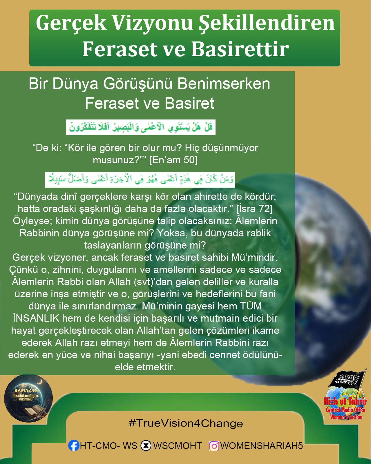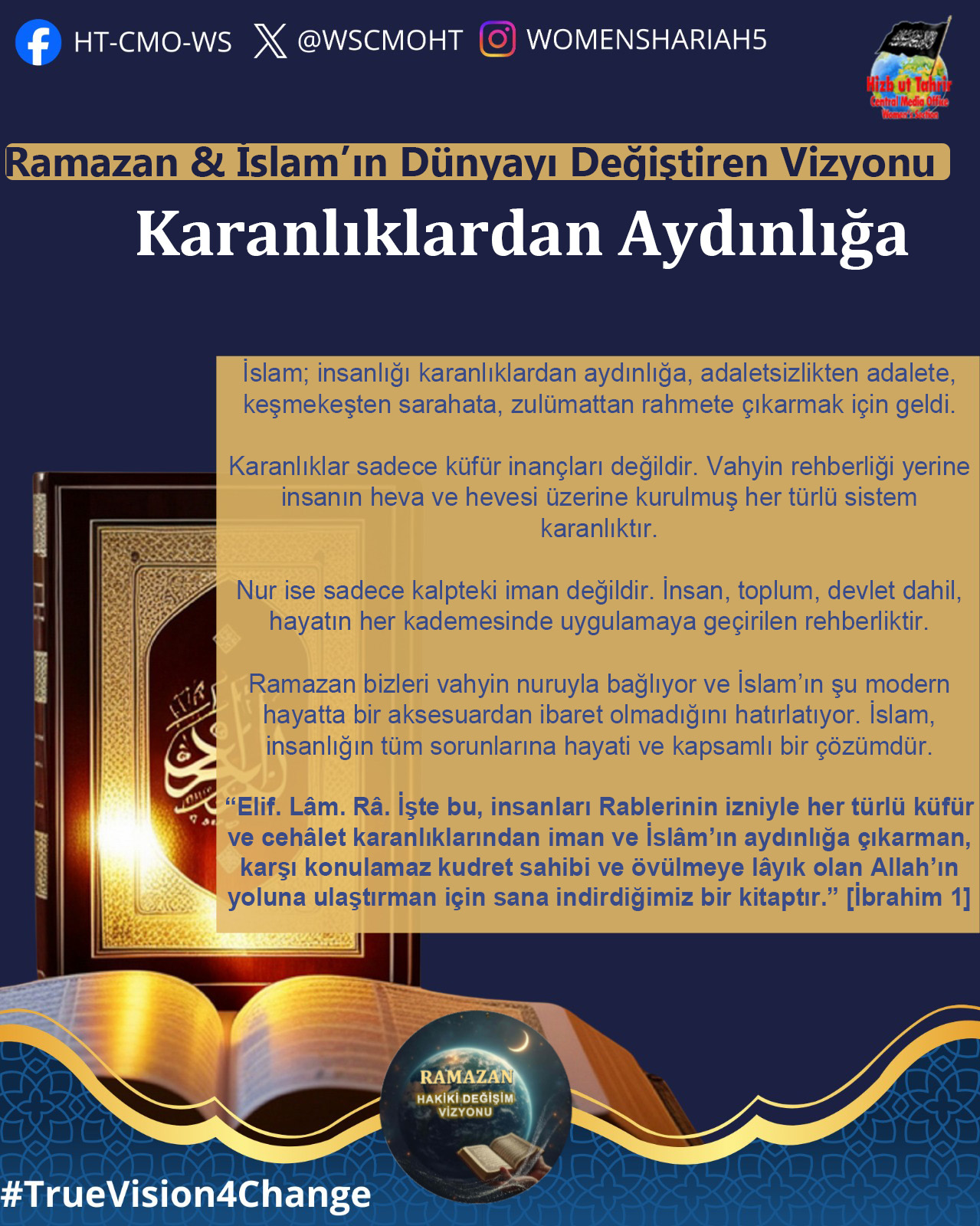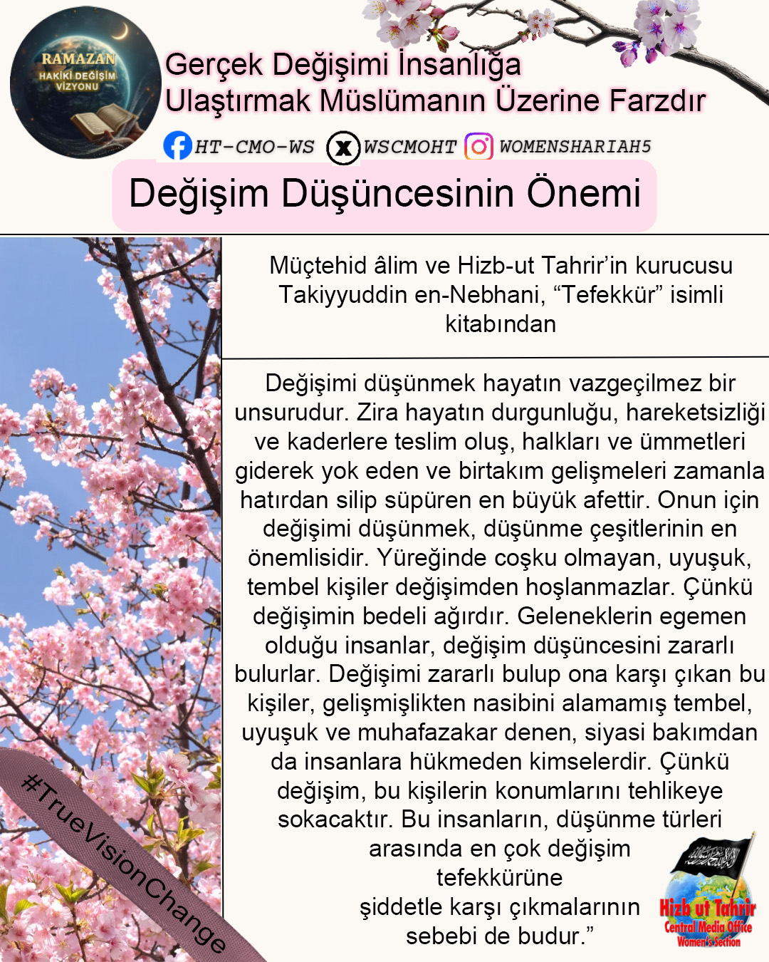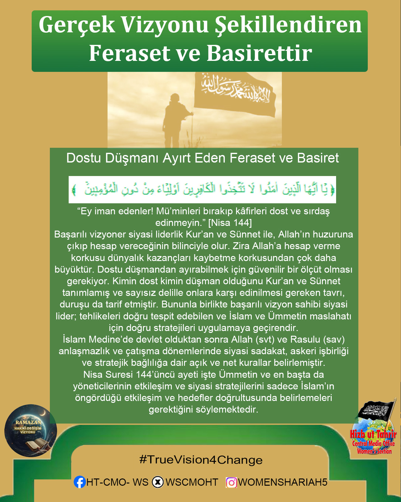 Ey Müslümanlar! Şüphesiz sizin izzetiniz, Raşidi Hilafet Devletinin geri dönüşünde saklıdır. Halkına asla yalan söylemeyen bir lider olan Hizb-ut Tahrir, ihlasla ve samimiyetle kendisini İslami hayatı yeniden başlatmaya ve Raşidi Hilafet’i kurmaya adamıştır. O, gerçekten de halkına yalan söylemeyen bir liderdir; O, kokusu tertemiz olan ve bu temizliğe tahammül edemeyenlerin uzak durduğu bir partidir... Biz onun ve onunla birlikte çalışan tüm gençlerin böyle olduğunu düşünüyoruz; onların ciddi, çalışkan, ihlaslı olduklarını, Allah’ın izniyle dünyaya baktıklarından katbekat fazlasıyla ahirete baktıklarını, Allah’ın vaadini ve Rasûlü SallAllahu Aleyhi ve Sellem’in müjdesini gerçekleştirmek için Allah’ın rahmetini umarak gecelerini gündüzlerine kattıklarını biliyoruz. Kuşkusuz bu, Allah’a hiç de zor değildir.