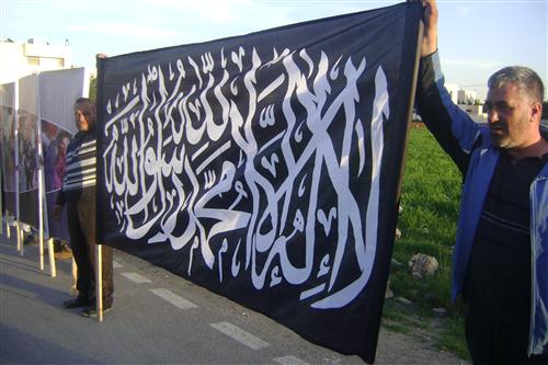 ورفع المشاركون راية " الخلافة " - لا إله إلا الله محمد رسول الله-، وتضمنت الوقفة الاحتجاجية على معرض للصور الفوتوغرافية لضحايا الأحداث في سوريا.
