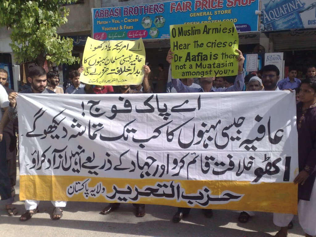 في الرابع والعشرين من أيلول 2010 نظم شباب حزب التحرير في باكستان سلسلة مسيرات في مختلف المدن الرئيسية للاحتجاج على الحكم الظالم بحق ابنة باكستان البارة "الدكتورة عافية صديقي" بعد أن تم تلفيق التهم لها. حمل المشاركون في المسيرة يافطات كتب عليها " أيها الجيوش الإسلامية، عافية تستصرخكم، فهل من معتصم بينكم؟" و " يا جيش باكستان، هب لنجدة عافية، وأقم الخلافة جُنّة المسلمين".