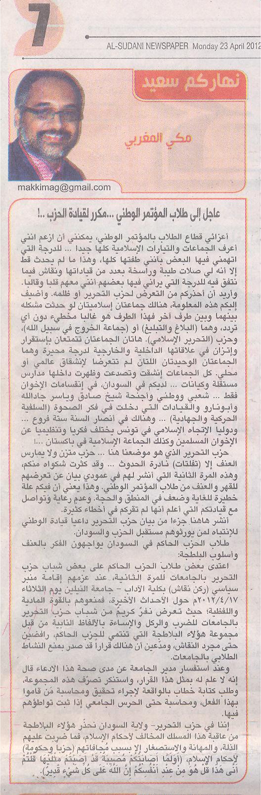 الأستاذ / مكي المغربي، مسؤول العلاقات الخارجية باتحاد الصحافيين السودانيين، ومسؤول لجنة الحريات وحقوق الإنسان بالاتحاد، وباحث في الحركات الإسلامية، يتابع عن كثب حال المسلمين والجماعات الإسلامية في آسيا الوسطى. يكتب في زاوية يومية بصحيفة السوداني. وفي العدد رقم (2279) بتاريخ 23/04/2012م كتب في عموده (نهاركم سعيد) تحت عنوان: (عاجل إلى طلاب المؤتمر الوطني... مكرر لقيادة الحزب.!) ما يلي: