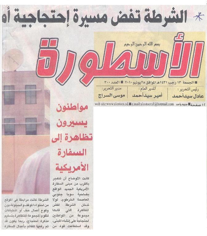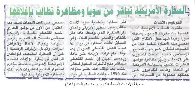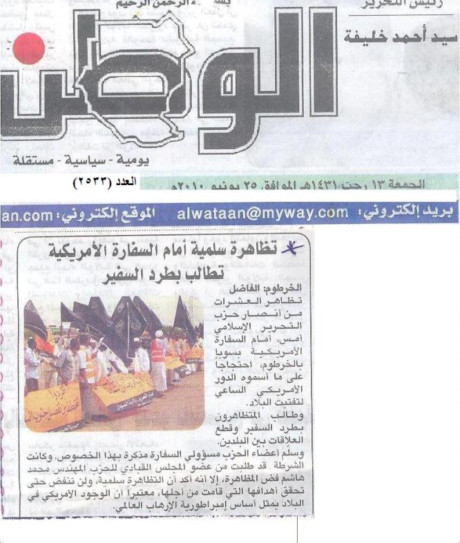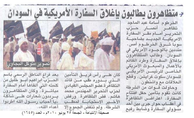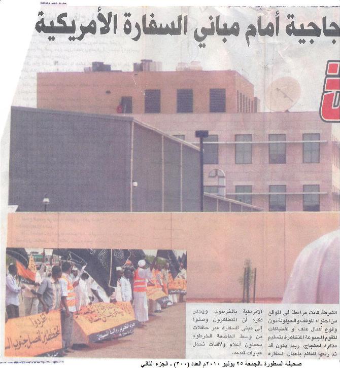 وفي يوم الجمعة 25/06/2010م أوردت عدد من الصحف الآتية خبراً عن التظاهرة منها صحيفة الصحافة؛ وهي من أعرق الصحف السودانية، أوردت في صفحتها الأولى خبراً بعنوان: (مظاهرة لحزب التحرير تطالب بإغلاق سفارة امريكا الجديدة).