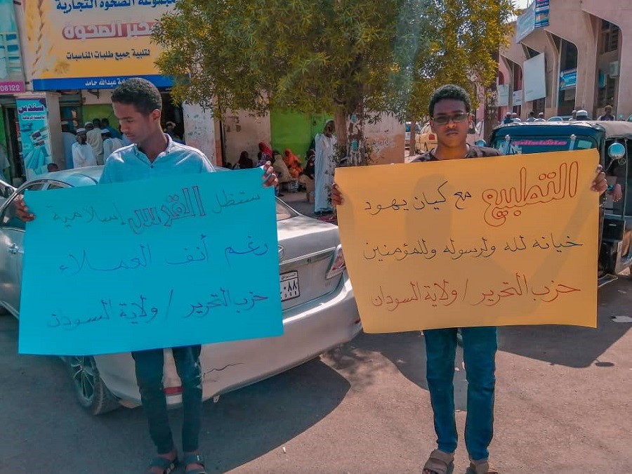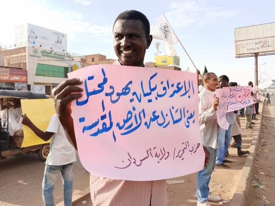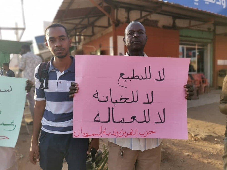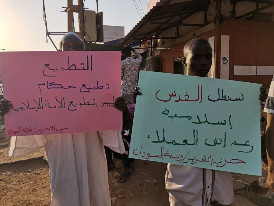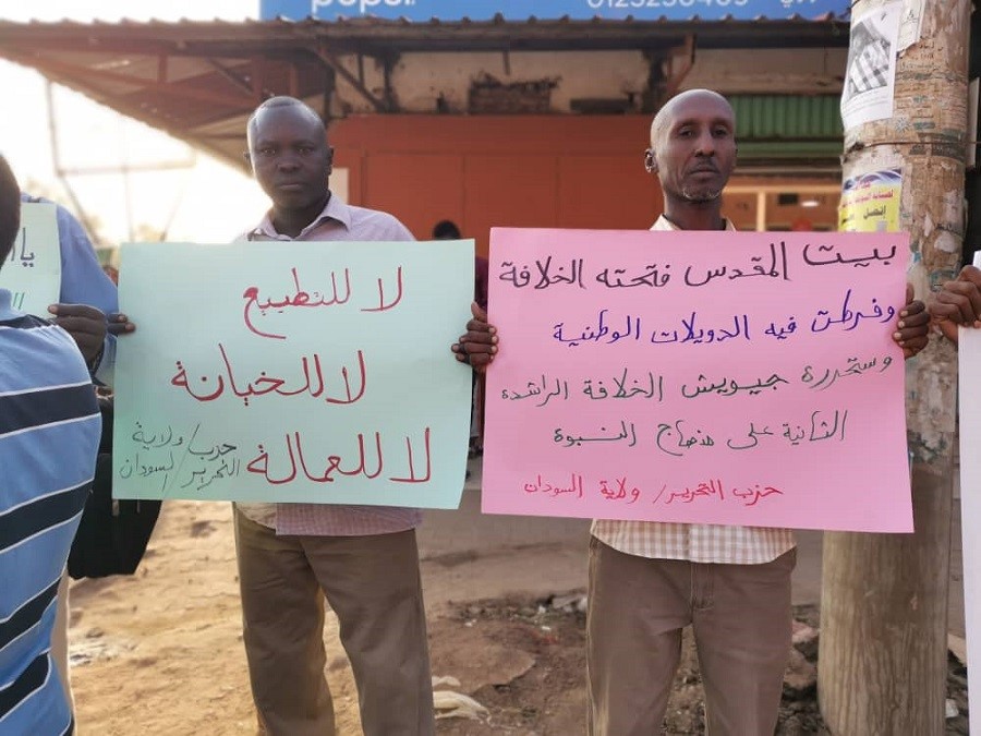 وفي يوم الأحد الموافق 25 تشرين الأول/أكتوبر 2020م قام حزب التحرير/ ولاية السودان بتوزيع نشرة في العاصمة وأغلب مدن السودان المختلفة، بعنوان: "التحاق البرهان وحمدوك بقطار الخيانة يؤكد عمالتهما للأعداء وإخلاصهما لهم ويحتّم العمل لإقامة الخلافة"، وقد تفاعل الناس مع النشرة بالتكبير والتهليل. أما دعاة القبول بهذه الخيانة فقد تكفل عوام الناس بالرد عليهم ولم يستطيعوا المواجهة بفكرهم المنحرف الداعي للقبول بهذه المؤامرة، وفي اليوم ذاته، يوم الأحد 25 تشرين الأول/أكتوبر2020م، كان شباب الحزب بمدينة القضارف في خط الدفاع عن مسرى رسول الله ﷺ حيث أقام شباب حزب التحرير/ ولاية السودان بمدينة القضارف وقفة احتجاجية بعنوان: (التطبيع مع يهود خيانة لله ورسوله والمؤمنين)، أمام مسجد عبد القادر عبد المحسن عقب صلاة الظهر، وقد تخللت الوقفة كلمة ألقاها الأستاذ ميسرة يحيى محمد نور، عبر فيها عن رفض جريمة التطبيع التي أقدمت عليها الحكومة الانتقالية بشقيها المدني والعسكري.