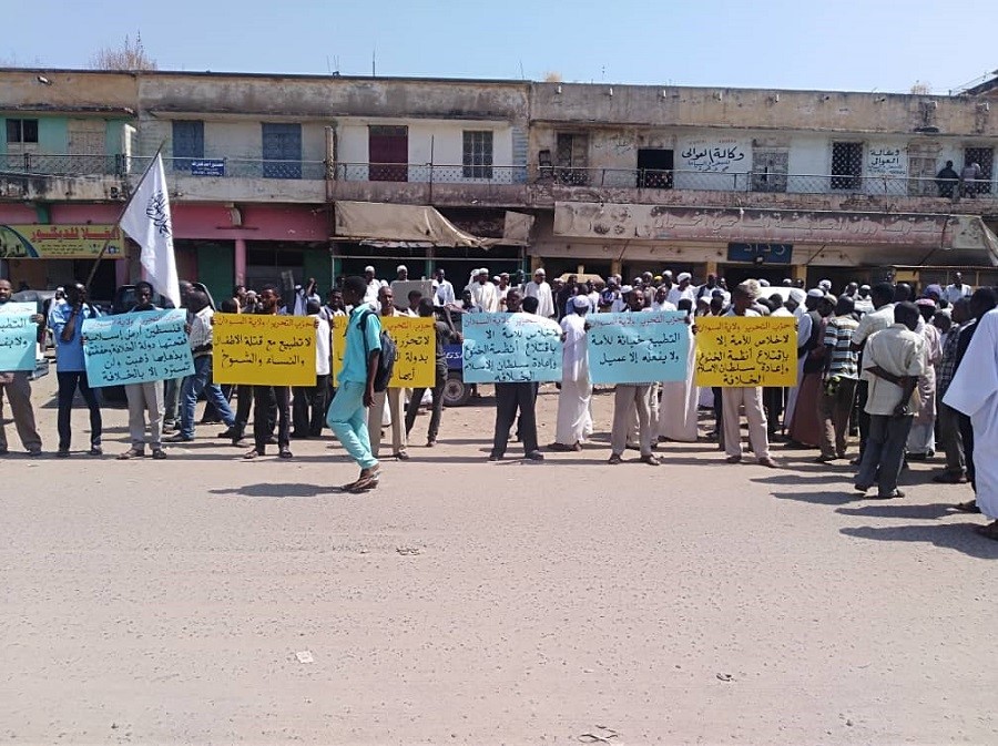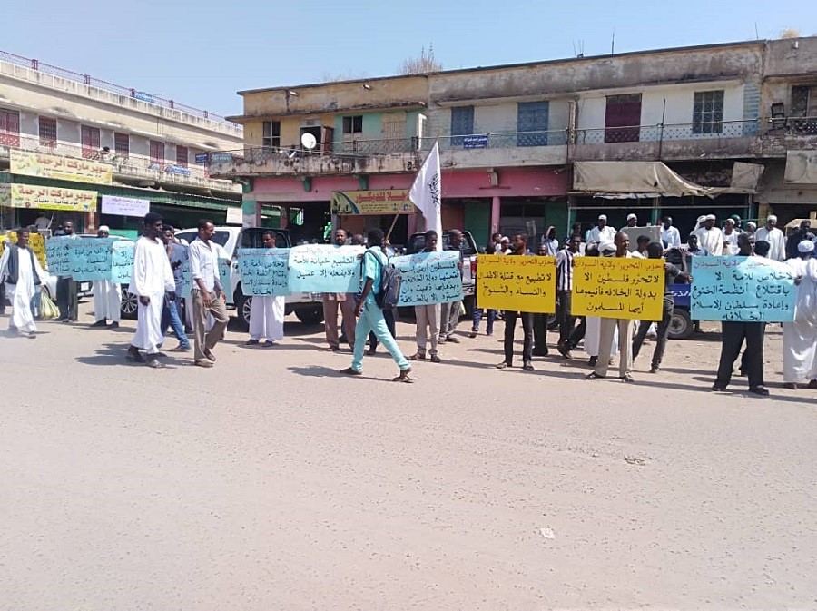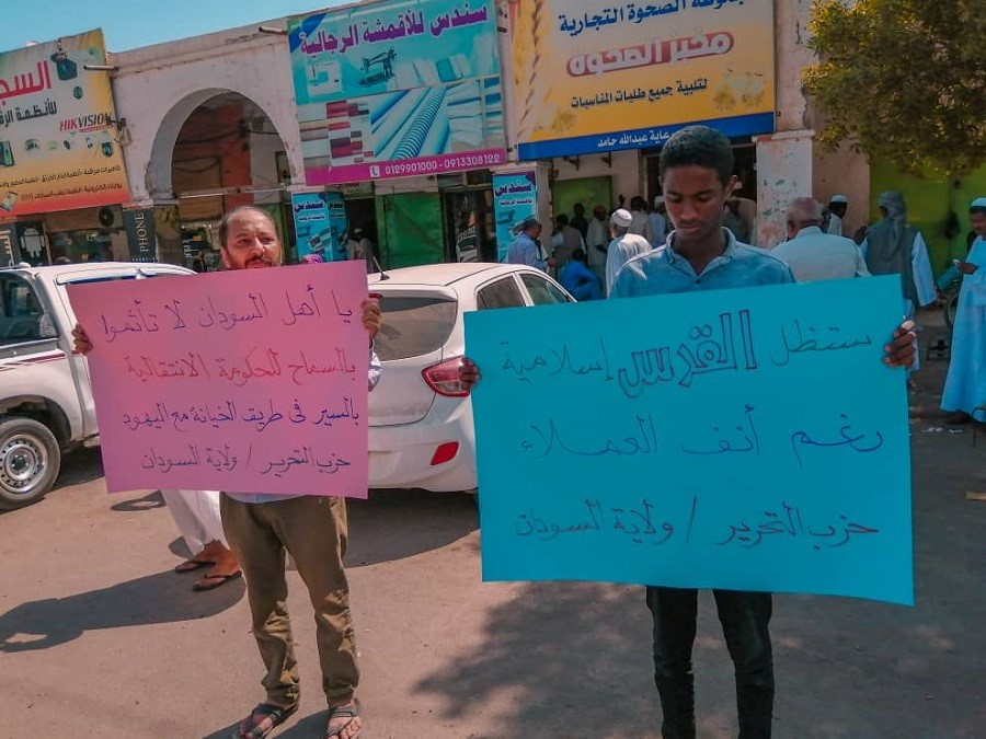 وها هي مدينة بورتسودان بشرق السودان تدخل في حمل الدفاع عن مسرى رسول الله ﷺ بمشاعر إسلامية عالية ووسط تكبيرات وتهليل المصلين، حيث أقيمت وقفة احتجاجية أمام مسجد مدينة بورتسودان الكبير وذلك يوم السبت 31 تشرين الأول/أكتوبر 2020م، وقد رفعت شعارات ترفض جريمة التطبيع مع كيان يهود، وتفاعل معها المصلون بشكل لافت للنظر.