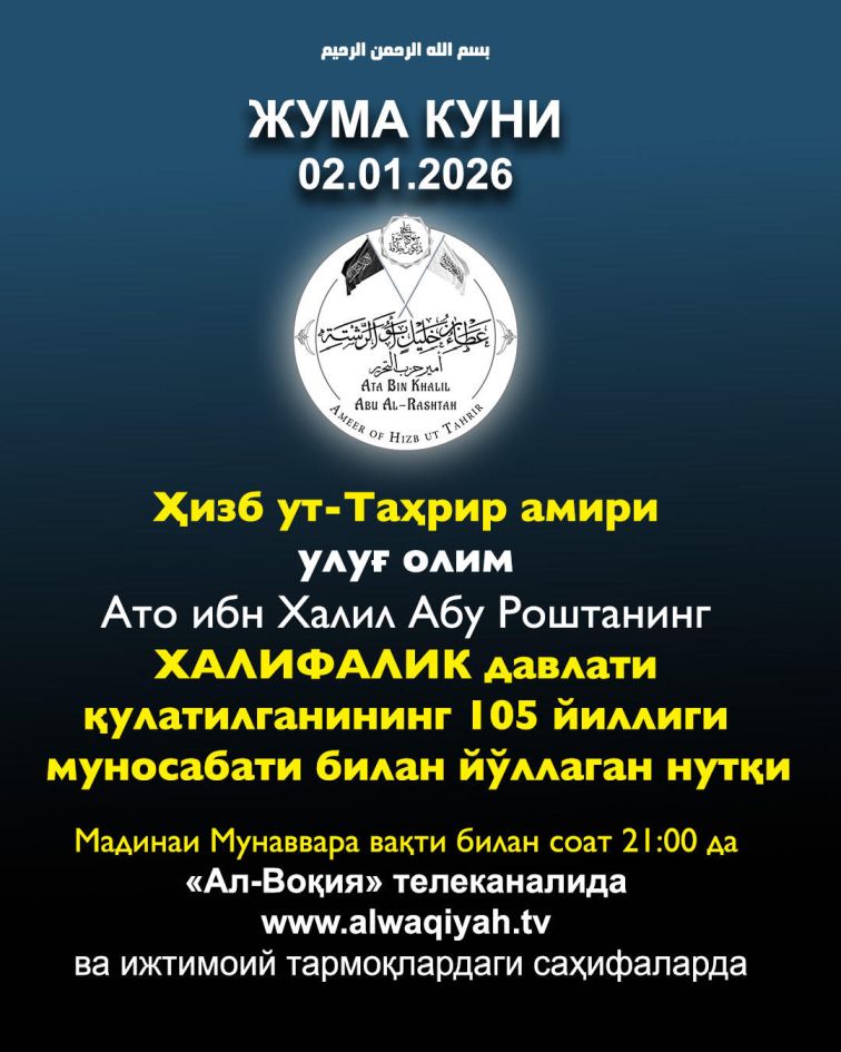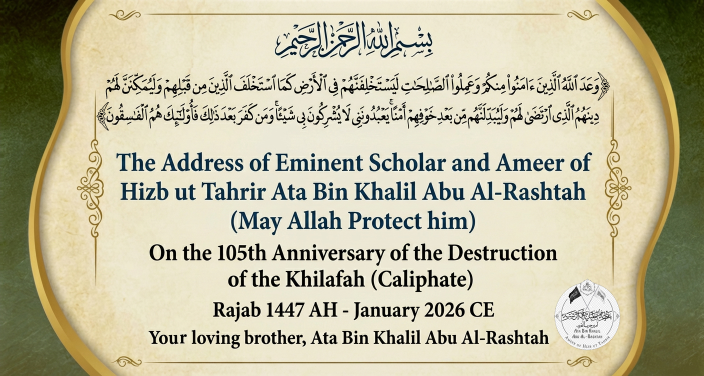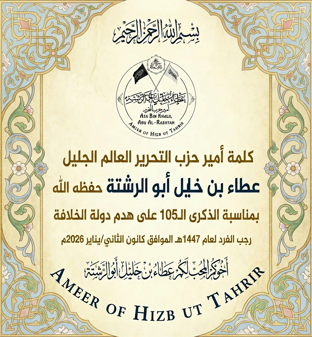 في الذكرى الـ105، تجديد الدعوة لكل قوى الأمة أن تحشد طاقاتها لإقامة الخلافة الراشدة 12 رجب المحرم 1447هـ الموافق 01 كانون الثاني/يناير 2026م