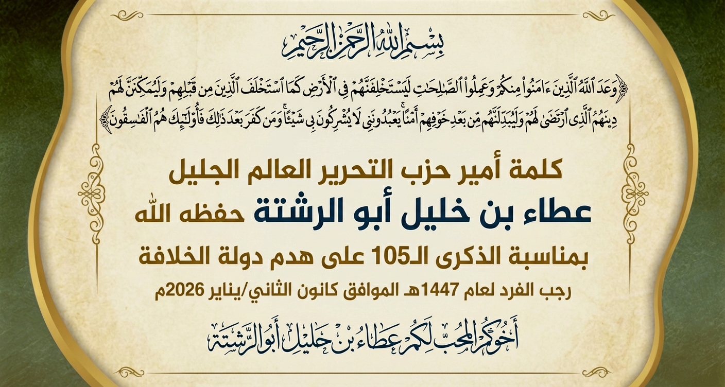 بمناسبة الذكرى الـ105 على هدم دولة الخـ ـلافة الشيخ /عطاء بن خليل أبو الرشتة 14 من رجب 1447هـ الموافق 03 كانون الثاني/يناير 2026مـ |