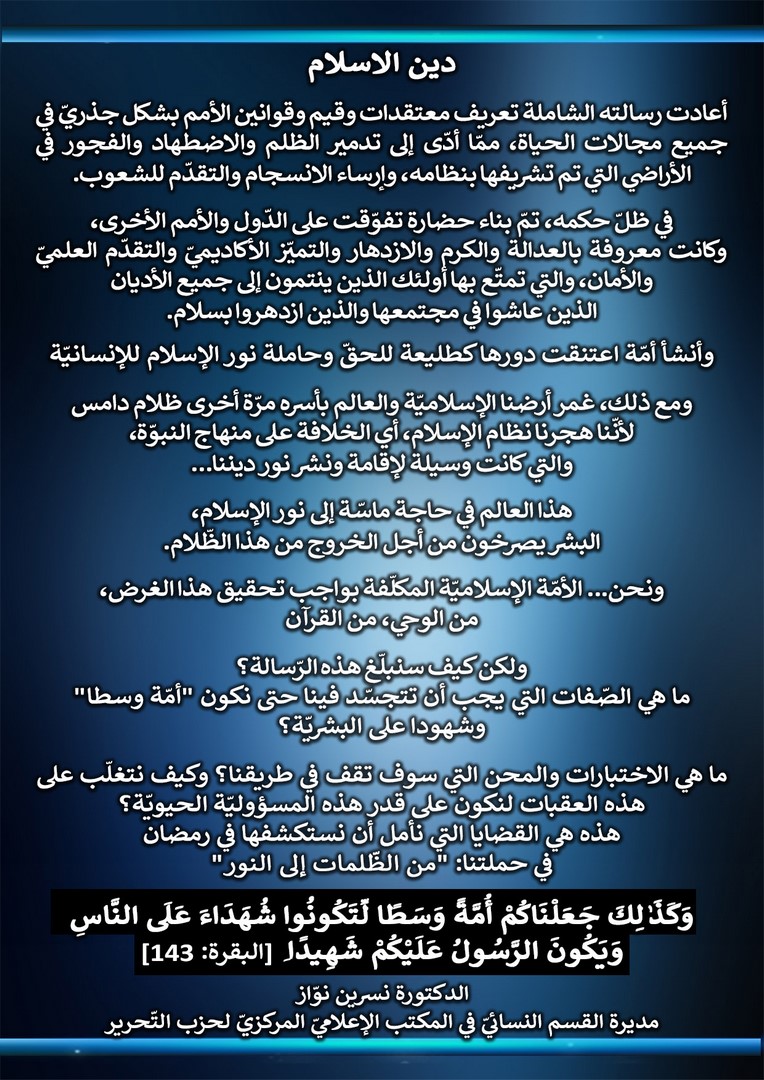 العالم اليوم في حاجة ماسة إلى نور الإسلام. البشر يصرخون لإخراجهم من الظلام الذي يجتاحهم. ونحن، الأمة الإسلامية التي تم تكليفها بواجب تحقيق الغرض من الوحي من القرآن. لكن كيف نحقق هذا؟ كيف يمكن للإسلام أن يحل عدداً كبيراً من المشاكل التي تصيب البشرية اليوم؟ ما هي الصفات التي يجب علينا كمسلمين تجسيدها لنكون "أمة وسطا" وشهودا على البشرية؟ ما الاختبارات التي سوف تقف في طريقنا؟ وكيف نتغلب على العقبات في الوفاء بهذه المسؤولية الحيوية؟ هذه هي القضايا التي سيتم استكشافها في رمضان من قبل القسم النسائي في المكتب الإعلامي المركزي لحزب التحرير في حملتنا... "من الظلمات إلى النور".