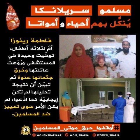 أطلق القسم النسائي في المكتب الإعلامي المركزي لحزب التحرير حملة واسعة لرفع الوعي العالمي بالمظالم الجسيمة والانتهاكات التي يتعرض لها المسلمون في سريلانكا، ومطالبة الحكومة السريلانكية بإنهاء سياستها المشينة المتمثلة في الحرق الإجباري لجثث ضحايا كوفيد-١٩ المسلمين في البلاد. فمنذ نيسان/أبريل من هذا العام، تم حرق جثامين عشرات المسلمين الذين ثبتت إصابتهم بفيروس كورونا في انتهاك فاضح لمعتقداتهم الإسلامية.
