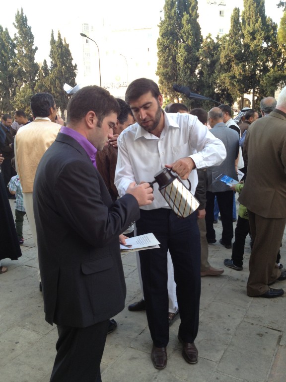 وقدم شباب حزب التحرير القهوة والتمر وأنواع أخرى من الحلويات للمصلين مهنئين لهم بحلول عيد الأضحى المبارك، وقد علت تكبيرات العيد أمام المساجد والمصليات التي أقيمت لصلاة العيد عبر مكبرات الصوت التي أعدها شباب الحزب لهذه الحملة.