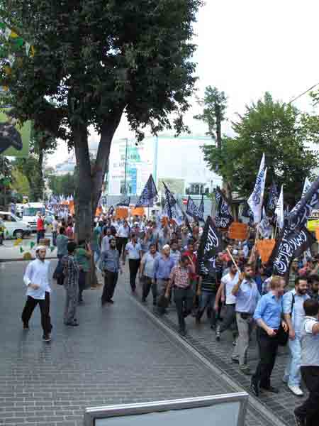 نظم شباب وأنصار حزب التحرير / ولاية تركيا في جامع الفاتح بمدينة اسطنبول مظاهرة ضخمة حضرها الآلاف وغطتها وسائل الإعلام تضمنها إلقاء بيانات صحفية للتنديد بالمجازر الوحشية التي ترتكب في مصر الكنانة تجاه المسلمين العزل المطالبين بتحكيم شرع الله في أرضه..
