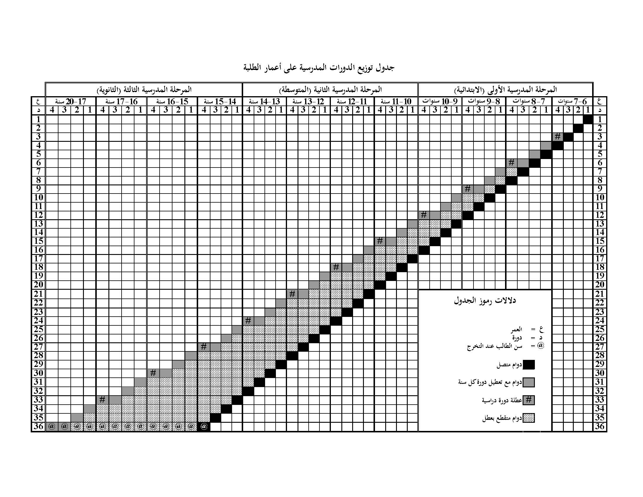 جدول يبين توزيع أعمار الطلاب على الدورات المدرسية. ويظهر الجدول حَدّيْنِ، يقع معظم الطلبة بينهما. الأول يمثل طالبا يدرس الدورات الست والثلاثين بنجاح دون أخذ أية إجازة خلال دراسته (يمثّل في الجدول بمربع أسود)، وبالتالي فإن الطالب ينهي المرحلة المدرسية في 9 سنوات، وهي أقل فترة زمنية لإنهاء المراحل المدرسية الثلاث. والحد الآخر يمثل طالبا يأخذ دورة دراسية كإجازة كل عام (يمثَّل في الجدول بمربع رمادي) وينجح في الدورات كلها، وبالتالي فهو ينهي المرحلة المدرسية في 12 سنة هجرية. وما بين هذين الحدين يقع معظم الطلبة (يمثل ذلك بالمربعات المخططة قُطريا).