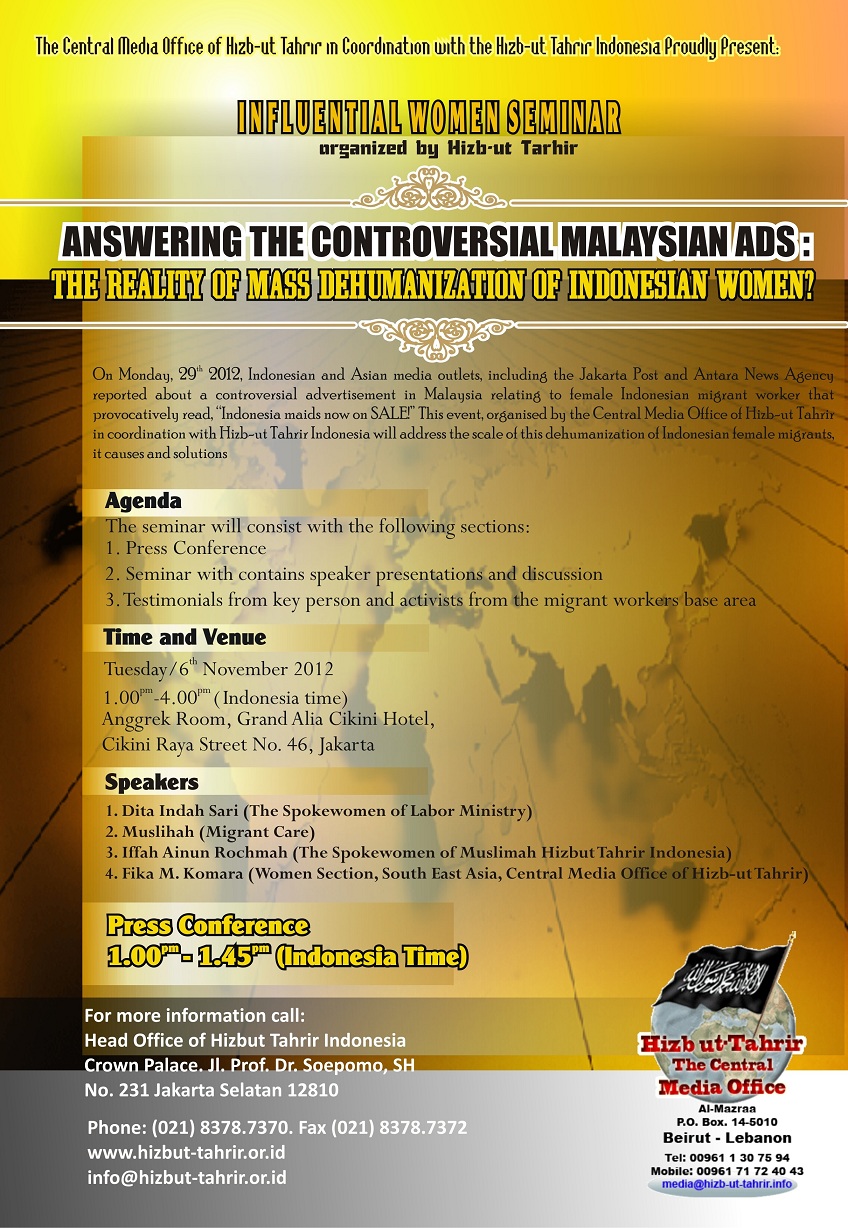 20 Dhu al-Hijjah 1433 | Monday, 05 November 2012م Be the first to comment! font size decrease font size increase font size بسم الله الرحمن الرحيم The Central Media Office and Hizb ut Tahrir/ Indonesia Present: Influential Women Seminar More in this category: « MEDIA RELEASE: HIZB UT TAHRIR/ INDONESIA TOGETHER WITH SOME ISLAMIC GROUPS HELD PRESS CONFERENCE TO CONDEMN THE SUICIDE BOMB IN THE MOSQUE AT POLICE STATION The Central Media Office and Hizb-ut Tahrir/ Indonesia Present: Influential Women Seminar » Leave a comment Make sure you enter the (*) required information where indicated. HTML code is not allowed. Name * Email * Website URL Enter the two words you see below Message * enter your message here... back to top