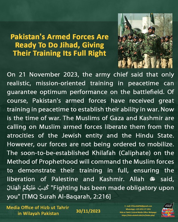 On 21 November 2023, the army chief said that only realistic, mission-oriented training in peacetime can guarantee optimum performance on the battlefield. Of course, Pakistan's armed forces have received great training in peacetime to establish their ability in war. Now is the time of war. The Muslims of Gaza and Kashmir are calling on Muslim armed forces liberate them from the atrocities of the Jewish entity and the Hindu State. However, our forces are not being ordered to mobilize. The soon-to-be-established Khilafah (Caliphate) on the Method of Prophethood will command the Muslim forces to demonstrate their training in full, ensuring the liberation of Palestine and Kashmir. Allah ﷻ said,