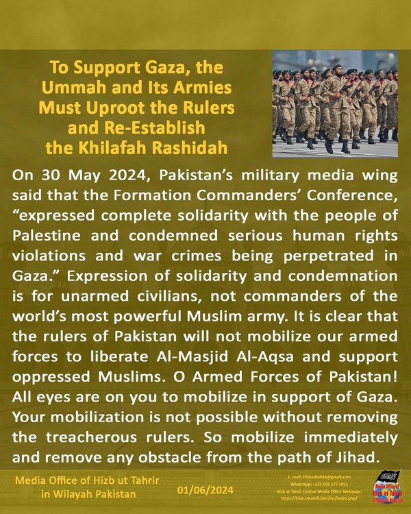 On 30 May 2024, Pakistan’s military media wing said that the Formation Commanders’ Conference, “expressed complete solidarity with the people of Palestine and condemned serious human rights violations and war crimes being perpetrated in Gaza.” Expression of solidarity and condemnation is for unarmed civilians, not commanders of the world’s most powerful Muslim army. It is clear that the rulers of Pakistan will not mobilize our armed forces to liberate Al-Masjid Al-Aqsa and support oppressed Muslims. O Armed Forces of Pakistan! All eyes are on you to mobilize in support of Gaza. Your mobilization is not possible without removing the treacherous rulers. So mobilize immediately and remove any obstacle from the path of Jihad.
