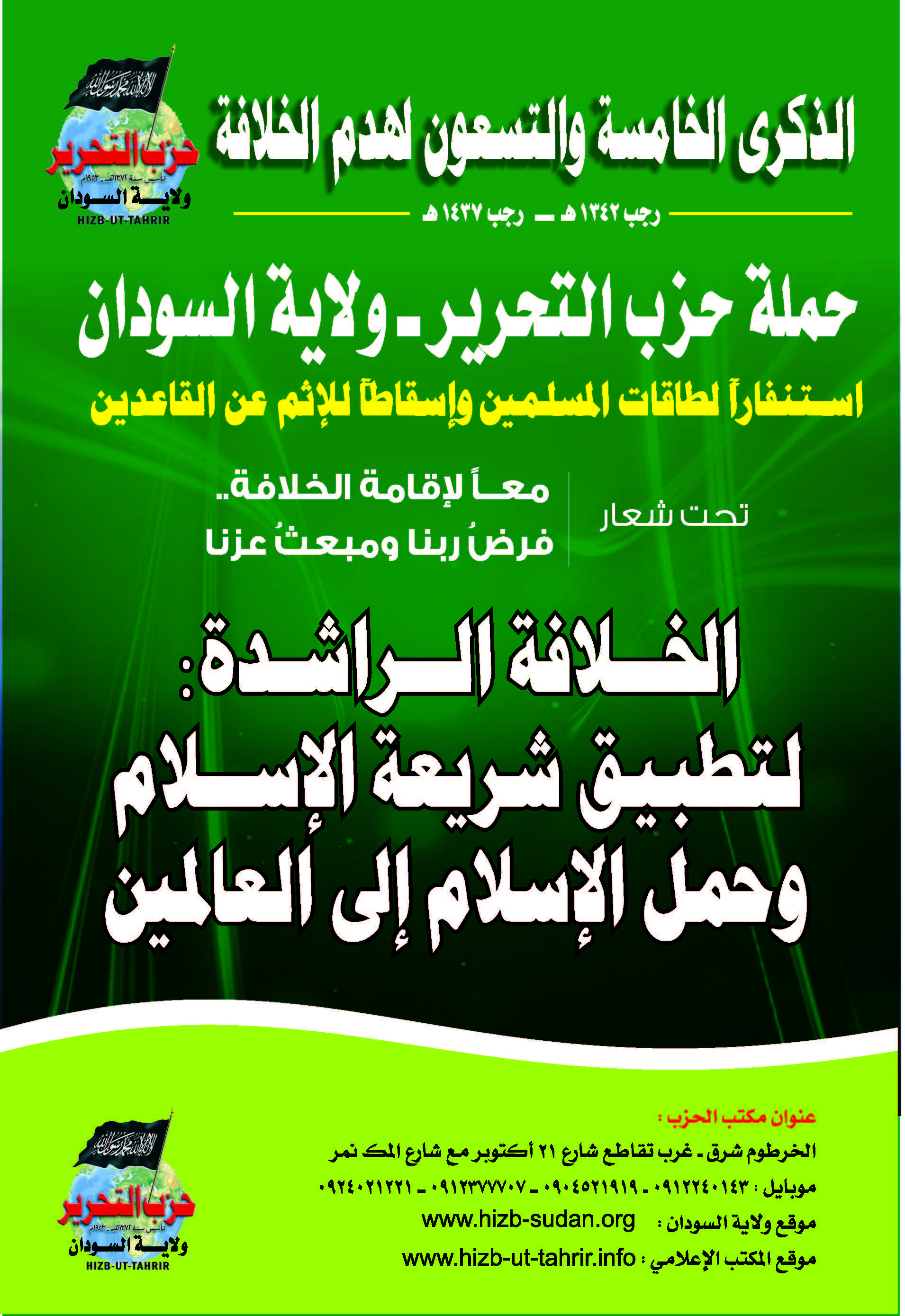 To revive the vital issue of the Ummah; namely, transforming the country into a land of Islam, and unifying it with other Muslim countries under the shade of the righteous Khilafah "Caliphate" (Caliphate) on the method of Prophethood, Hizb ut Tahrir Wilayah of Sudan will launch a campaign on the occasion of the 95th anniversary of the destruction of the Khilafah "Caliphate", throughout the month of Rajab, starting on Friday, the 1st of Rajab 1437 AH corresponding to the 8th of April 2016 CE, to mobilize the energies – capacities of Muslims to work to resume the Islamic way of life, and to remove the sin from those who neglected this duty, under the slogan: “United for the establishment of the Khilafah "Caliphate" ... The Obligation of our Lord and Source of our Dignity”.
