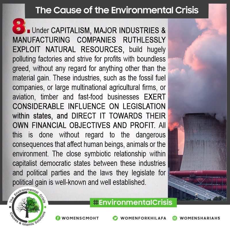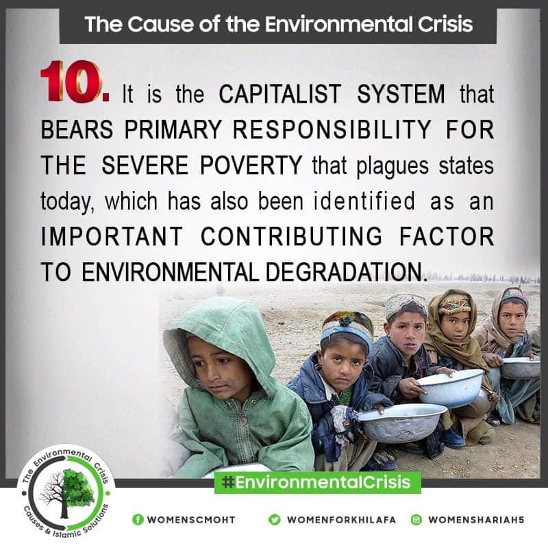 The root cause of the environmental crisis is the materialistic and profit-obsessed ‘Capitalist Ideology and Systems’ which dominates the politics, economics and social life of states today and which has created an unsustainable pattern of consumption and production within countries in its drive to secure revenue and economic gain over all other human needs and values, including the protection of the environment. The repeated abuse of the environment and emergence of a host of environmental problems are merely the fruits of this system; and the crisis that we bear witness to is nothing other than the legacy of this ideology.