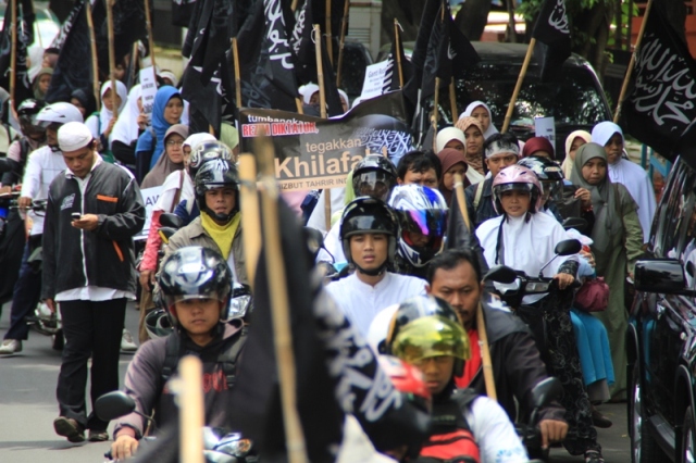 Jakarta. Around 200 protesters of Hizb ut-Tahrir Indonesia gave give political supports to the people of Libya to continue to fight for the atrocities of dictator Muamar Qaddafi, Thursday morning (24 / 2) in front of the Libyan Embassy, Jakarta. In this rally HTI condemned the atrocities committed by Muamar Qaddafi, a leader who prefers massacring his people rather than protecting his people to defend his corrupt power. HTI affirms that the people of Libya should not be satisfied with just the change of the despotic leader who is also the accomplice of British colonial and other colonial powers. Libyan people should fight for the establishment of the Khilafah "Caliphate". Only with the Khilafah "Caliphate" will the change of the system will run rightfully and truly. It is the system of Khilafah "Caliphate" that will solve problems of Muslims, including that of people of Libya. Farid-one of the orators - asserted that Libyan people must be vigilant to avoid their struggle being hijacked by those who support the ideas of liberalism and democracy who are also the British and the American accomplices. It is because what happens in the Middle East today is a form of popular resistance that has been oppressed by the dictator. "It is a natural reaction of people who have been oppressed not because of liberalism or democracy," he said. Therefore, if they want a real independence, it is Sharia and Khilafah "Caliphate" that should be enforced. Just in front of the gate of the Libyan Embassy, the protestors spanned a banner that reads: "Fight Againts Qadafi, the Muslim Butcher who Rejects the Sunnah!" The banner was a reminiscent of the Qadafi's atrocities who conducted extra judicial killings, by hanging 13 Hizb ut-Tahrir activists who tried to correct his thought who rejects the Sunnah of Prophet Muhammad PBUH as the source of law. (Mediaumat.com, 24/02/2011).