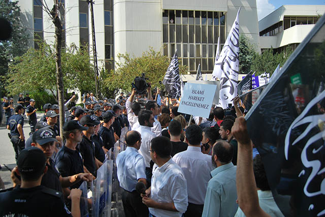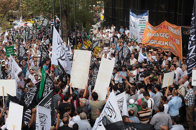 Hizb ut Tahrir/ Wilayah Turkey members and supporters organized a demonstration in Kojataph Mosque in Ankara attended by thousands and covered by the media guaranteed its delivery of press releases to condemn the brutal massacres committed in Egypt towards displaced Muslims calling for the rule of Allah's Shariah throughout the land.
