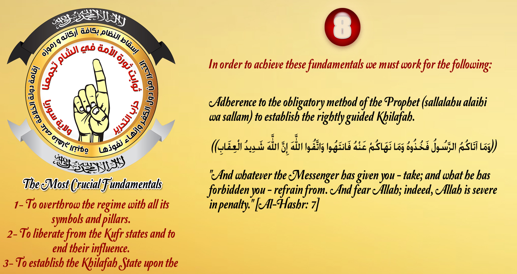 8. Adherence to the obligatory method of the Prophet (sallalahu alaihi wa sallam) to establish the rightly guided Khilafah "Caliphate".