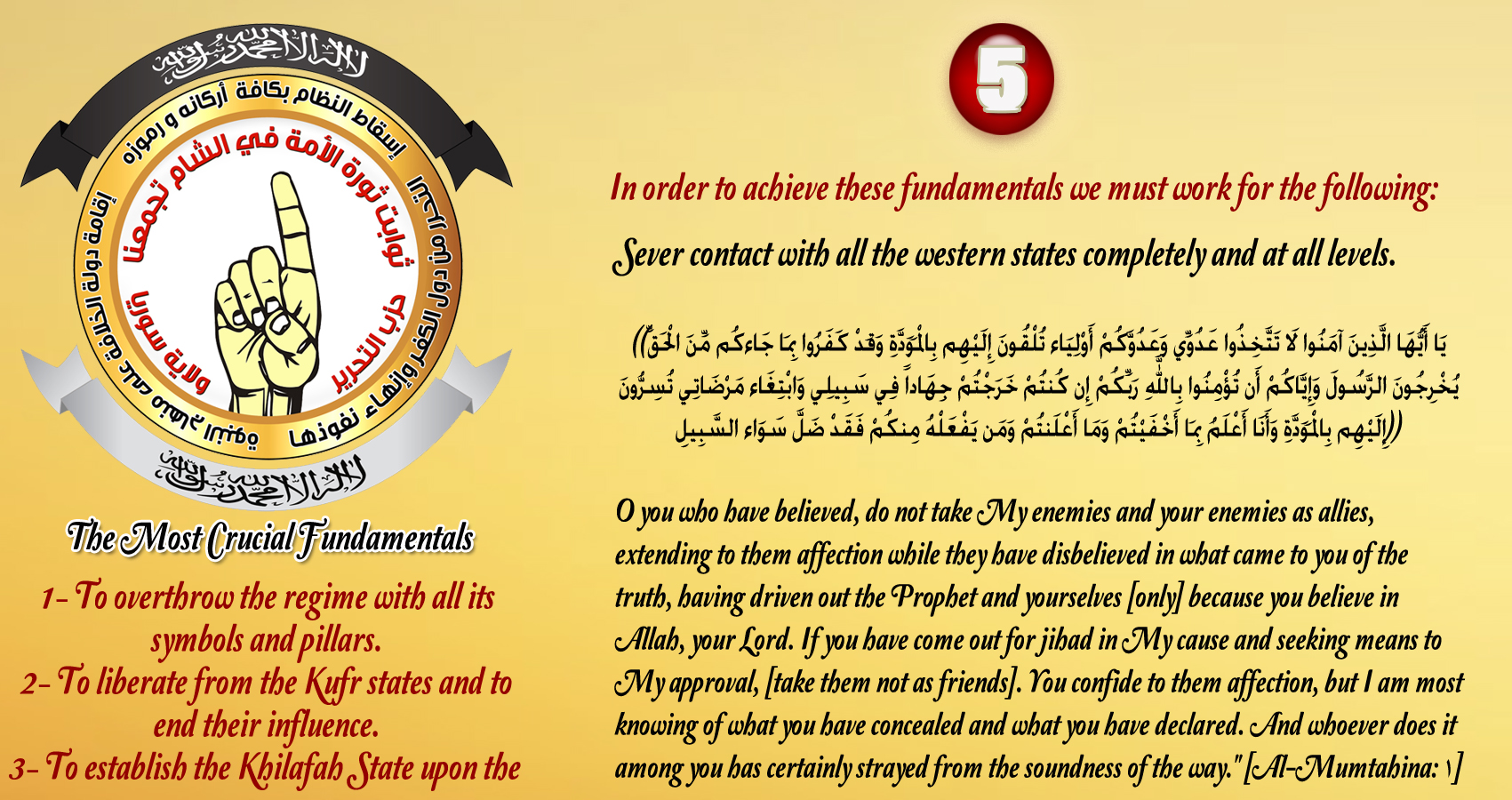 6. Sever any connections with all the states in the Muslim world completely and at all levels, because their rulers are agents to the West, they toil in attaining and protecting its interests; with the most important one is to prevent the return of the Khilafah "Caliphate" once more, and to maintain the democratic system.