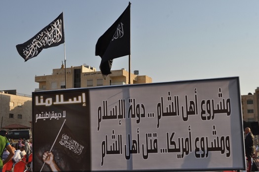 There were slogans raised and they included: "The revolutionaries of Ash-Sham said it: ‘We will not change our Deen for your democracy.'", "Until when will my blood in Ash-Sham and Egypt be sacrificed for the West?", "They lied and said:" The solution is in democracy, so the result was the massacre of Rab'a Al- Adawiyah" and "Your intervention is an aggression and an aid to your helpers". The local and international Media covered the assembly that had a noticeable security presence. Media outlets conducted many press interviews with the Head of the Media office and a number of participants.