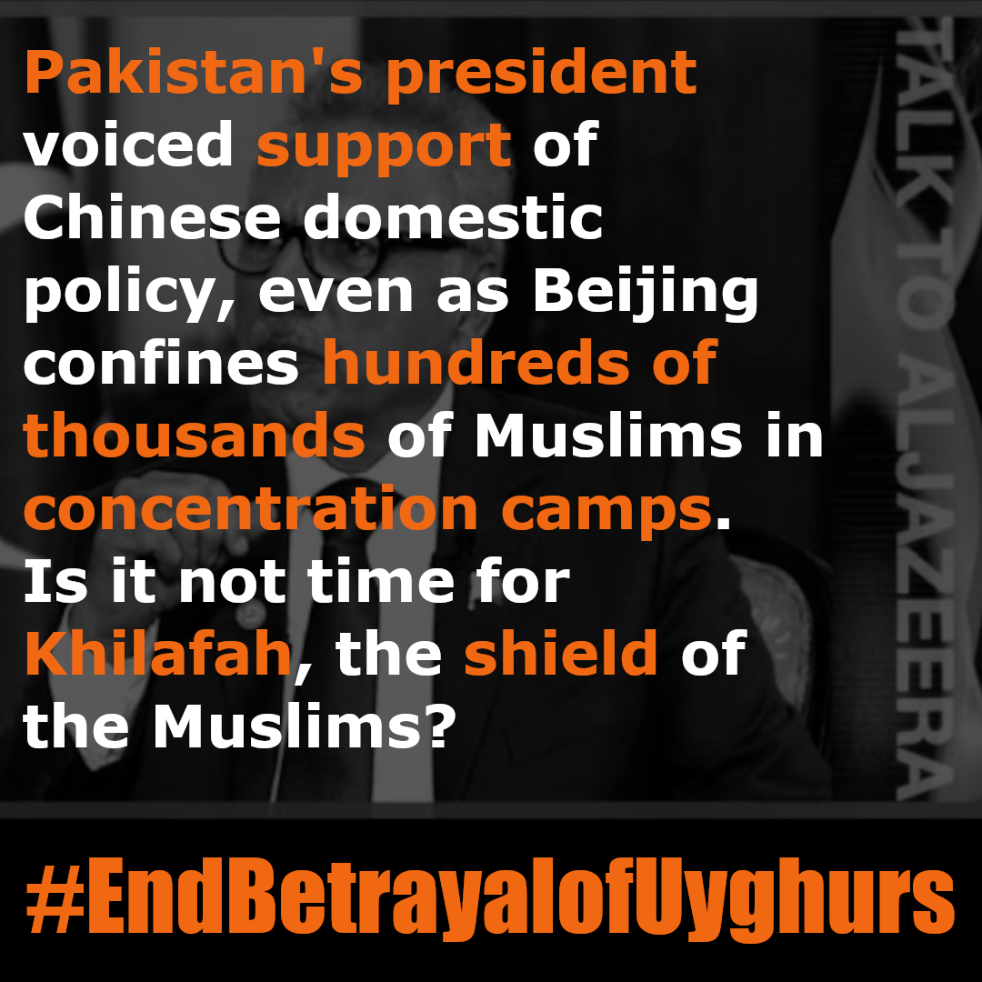 Pakistan’s rulers have already established a stance of alliance with those who openly persecute the Muslims, maintaining a condemnable silence at their oppression, rewarding their evil with economic deals. However, now Pakistan’s rulers have reached a new low, even for them, voicing support of the Chinese government, even as it wages war on the Deen of the Uyghur Muslims of East Turkestan. In an interview to Al-Jazeera broadcast on 30 December 2018, Pakistan’s President, Arif Alvi, voiced full confidence in China in handling those under its authority, when asked about Beijing’s brutal stance towards the long suffering Uyghur Muslims. Pakistan's president voiced support of China, even as it confines hundreds of thousands of Muslims in concentration camps, shackles Muslims and pours cements in their mouths until suffocation. He reposed confidence in China, even as it prevents the chaste Muslim women from conceiving and giving birth, whilst castrating Muslim men. And he granted support to a regime that places a Chinese spy in Muslim homes, in flagrant disregard to Islamic laws of privacy and separation of genders. Days have passed without a retraction of the regime’s poisonous support of the Chinese tyrants, without even regret or remorse.