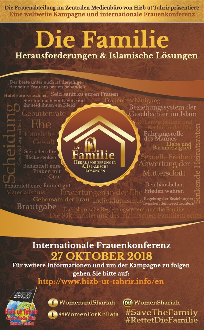Die Frauenabteilung im Zentralen Medienbüro von Hizb ut Tahrir startete eine weltweite Kampagne mit dem Titel „ Die Familie: Herausforderungen und Islamische Lösungen“ welche mit einer internationale Frauenkonferenz Ende Oktober beendet wird. Zahlreiche Vortragende aus aller Welt werden dabei sein.