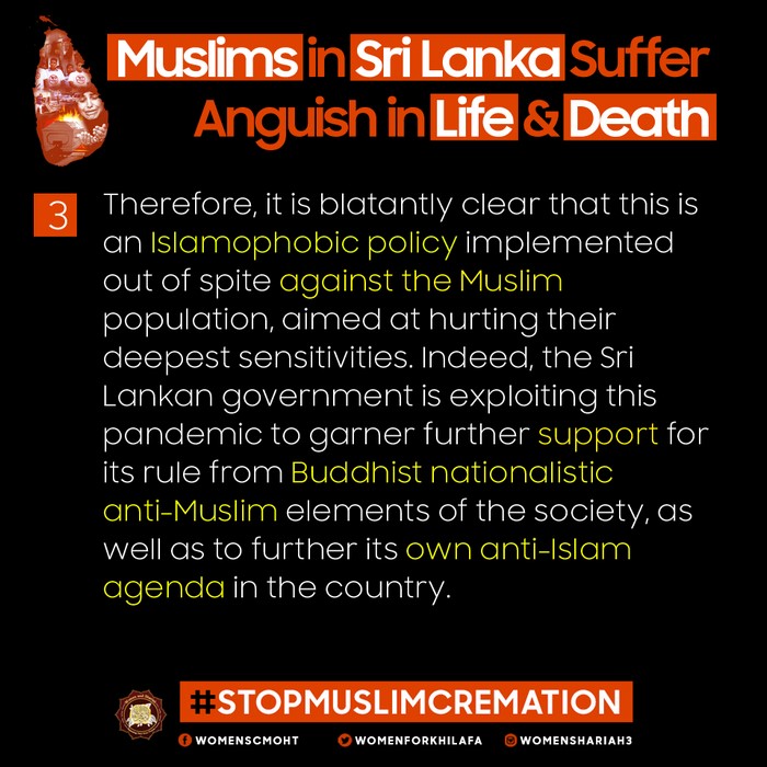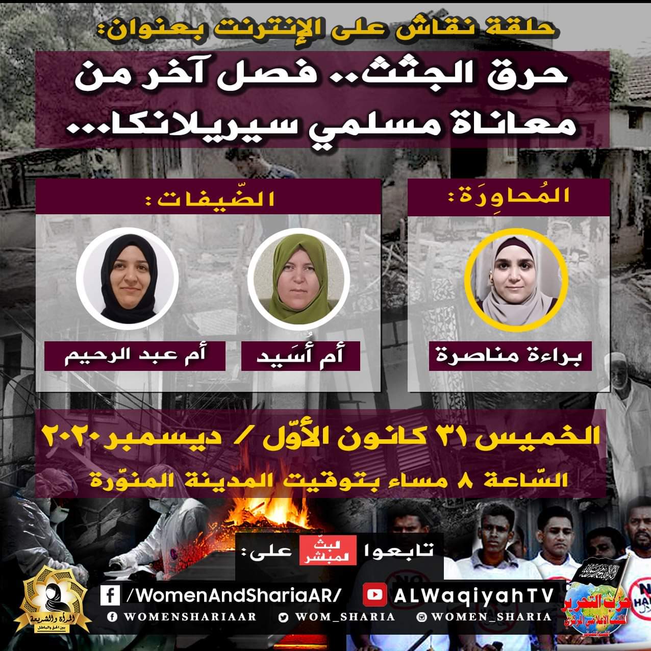 Kitengo cha wanawake katika Afisi Kuu ya Habari ya Hizb ut-Tahrir kimezindua kampeni pana ya kunyanyua utambuzi wa kiulimwengu juu ya dhulma kubwa na ukiukaji ambao Waislamu wanakabiliwa nao nchini Sri Lanka, na kuitaka serikali ya Sri Lanka kumaliza sera yake ya aibu ya kuchoma kwa nguvu maiti za wahasiriwa Waislamu wa COVID-19 nchini humo. Tangu Aprili mwaka huu, miili ya Waislamu wengi ambao walipimwa wakiwa na virusi vya Korona imechomwa, ikiwa ni ukiukaji mkali wa imani zao za Kiislamu.