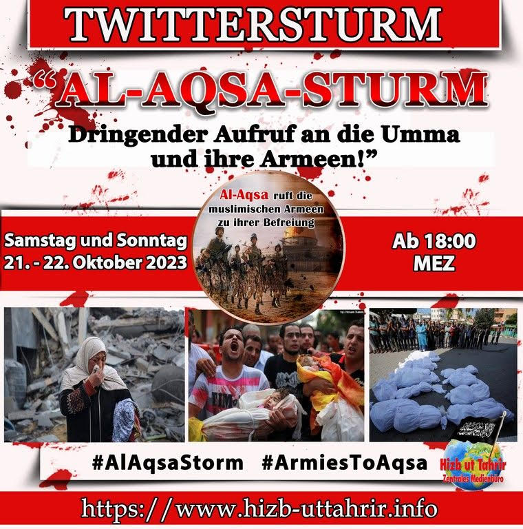 Kwa kuzingatia matendo ya kishujaa yaliyofanywa na mujahidina mashujaa katika Ardhi Iliyobarikiwa – Palestina chini ya kauli mbiu ya Kimbunga cha Al-Aqsa dhidi ya umbile nyakuzi la Kiyahudi linaloendelea, na kuzidi katika mashambulizi yake kwa Msikiti Uliobarikiwa wa Al-Aqsa na uzingiraji wake na ulipuaji mabomu ambao umeendelea kwa miaka 17 kwenye Ukanda wa Gaza, Afisi Kuu ya Habari ya Hizb ut Tahrir itafanya Tufani ya Twitter ambayo sasa inajulikana kama X chini ya kichwa: