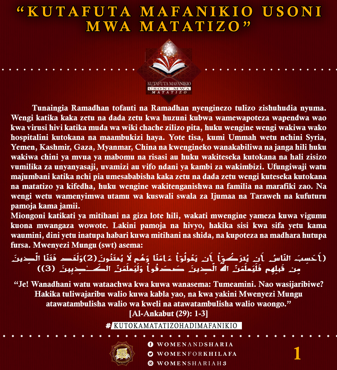 Na sisi katika Kitengo cha Wanawake katika Afisi Kuu ya Habari ya Hizb ut Tahrir tutayaeleza maswala haya "Kutafuta Mafanikio Usoni mwa Matatizo" kama kauli mbiu ya mwezi wa Ramadhan ulio barikiwa wa mwaka huu wa 1441 H.