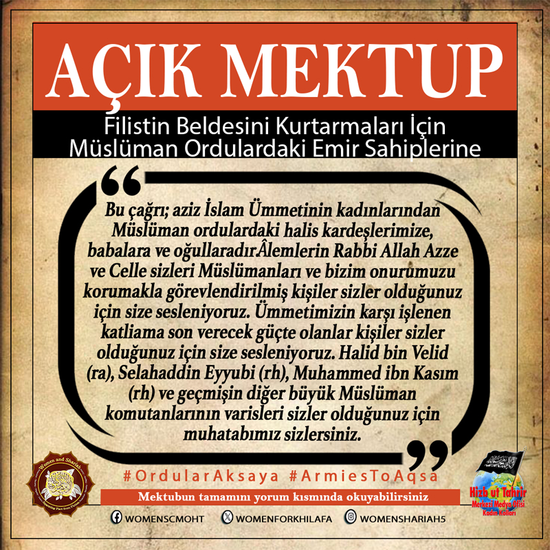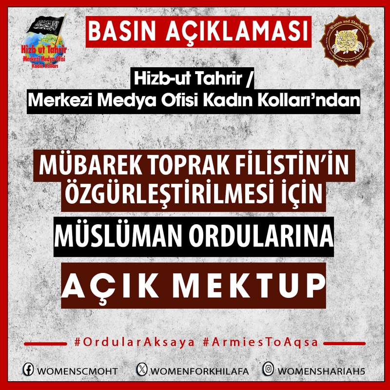 Hizb-ut Tahrir Merkezi Medya Ofisi Kadın Kolları olarak biz bugün, bu asil İslam ümmetinin kadınları adına, Müslüman toprakların ordularındaki samimi kardeşlerimize, babalarımıza ve oğullarımıza, Filistinli Müslümanları bu katil Yahudi varlığına karşı savunmak ve bu Mübarek Toprağın her karışını bu soykırımcı işgalin pençesinden kurtarmak için İslami görevlerini yerine getirmeye çağıran bir açık mektup yayınladık. Mektup birçok dile çevrilecek ve tüm kıtalardaki topluluklar içinde, sosyal medyada ve diğer çeşitli çevrimiçi platformlarda yaygın bir biçimde paylaşılacak.