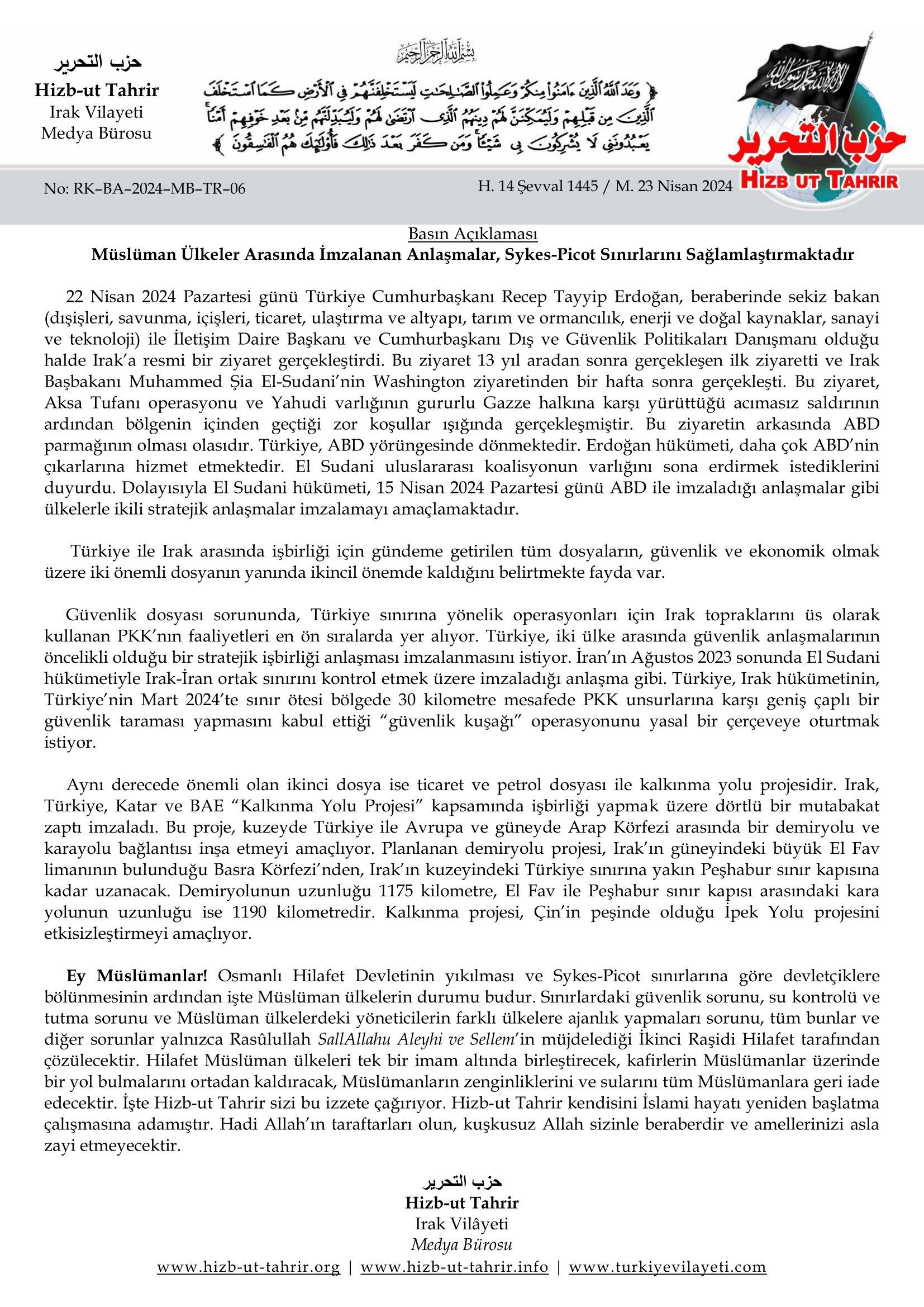 22 Nisan 2024 Pazartesi günü Türkiye Cumhurbaşkanı Recep Tayyip Erdoğan, beraberinde sekiz bakan (dışişleri, savunma, içişleri, ticaret, ulaştırma ve altyapı, tarım ve ormancılık, enerji ve doğal kaynaklar, sanayi ve teknoloji) ile İletişim Daire Başkanı ve Cumhurbaşkanı Dış ve Güvenlik Politikaları Danışmanı olduğu halde Irak’a resmi bir ziyaret gerçekleştirdi. Bu ziyaret 13 yıl aradan sonra gerçekleşen ilk ziyaretti ve Irak Başbakanı Muhammed Şia El-Sudani’nin Washington ziyaretinden bir hafta sonra gerçekleşti. Bu ziyaret, Aksa Tufanı operasyonu ve Yahudi varlığının gururlu Gazze halkına karşı yürüttüğü acımasız saldırının ardından bölgenin içinden geçtiği zor koşullar ışığında gerçekleşmiştir. Bu ziyaretin arkasında ABD parmağının olması olasıdır. Türkiye, ABD yörüngesinde dönmektedir. Erdoğan hükümeti, daha çok ABD’nin çıkarlarına hizmet etmektedir. El Sudani uluslararası koalisyonun varlığını sona erdirmek istediklerini duyurdu. Dolayısıyla El Sudani hükümeti, 15 Nisan 2024 Pazartesi günü ABD ile imzaladığı anlaşmalar gibi ülkelerle ikili stratejik anlaşmalar imzalamayı amaçlamaktadır.
