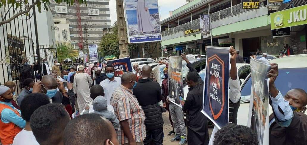 Gaspçı Yahudi varlığının mübarek Mescid-i Aksa'ya yönelik sürekli saldırıları, Gazze Şeridi'nin 15 yıldır devam eden kesintisiz kuşatması ve bombardımanı ve Mübarek Toprak Filistin’deki atmosfer ışığında, Hizb-ut Tahrir / Kenya, Müslümanlara Mescid-i Aksa'nın statüsünü hatırlatan ve ümmetin ordularının Mübarek Topraklardaki (Filistin) Müslümanları desteklemek için harekete geçmeleri ve onları işgalci Yahudilerin pisliğinden kurtarmasını talep eden bir dizi faaliyet organize etti. Etkinlik ve faaliyetlere yüzlerce Müslüman katılarak desteklerini ifade ettiler.