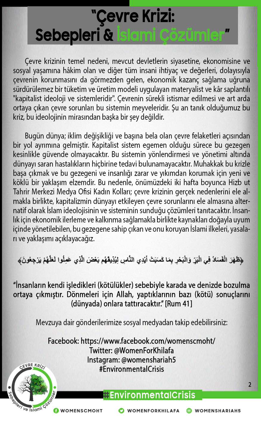 Bugün dünya; iklim değişikliği ve başına bela olan çevre felaketleri açısından bir yol ayrımına gelmiştir. Kapitalist sistem egemen olduğu sürece bu gezegen kesinlikle güvende olmayacaktır. Bu sistemin yönlendirmesi ve yönetimi altında dünyayı saran hastalıkların hiçbirine tedavi bulunamayacaktır. Muhakkak bu krizle başa çıkmak ve bu gezegeni ve insanlığı zarar ve yıkımdan korumak için yeni ve köklü bir yaklaşım elzemdir. Bu nedenle, önümüzdeki iki hafta boyunca Hizb‑ut Tahrir Merkezi Medya Ofisi Kadın Kolları; çevre krizinin gerçek nedenlerini ele almakla birlikte, kapitalizmin dünyayı etkileyen çevre sorunlarını ele almasına alternatif olarak İslam ideolojisinin ve sisteminin sunduğu çözümleri tanıtacaktır. İnsanlık için ekonomik ilerleme ve kalkınma sağlamakla birlikte kaynakları doğayla uyum içinde yönetilebilen, bu gezegene sahip çıkan ve onu koruyan İslami ilkeleri, yasaları ve yaklaşımı açıklayacağız.