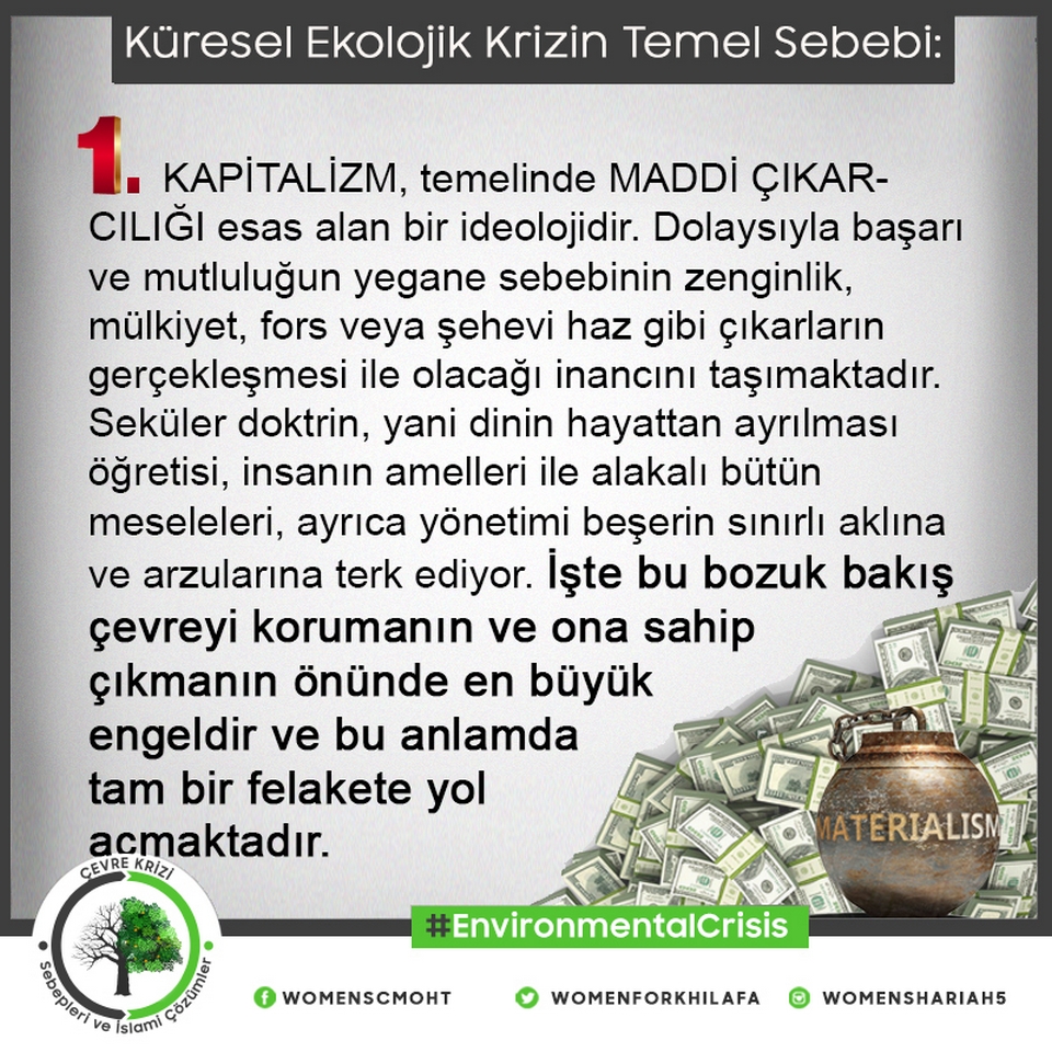 Çevre krizinin temel nedeni, mevcut devletlerin siyasetine, ekonomisine ve sosyal yaşamına hâkim olan ve diğer tüm insani ihtiyaç ve değerleri, dolayısıyla çevrenin korunmasını da görmezden gelen, ekonomik kazanç sağlama uğruna sürdürülemez bir tüketim ve üretim modeli uygulayan materyalist ve kâr saplantılı "kapitalist ideoloji ve sistemleridir". Çevrenin sürekli istismar edilmesi ve art arda ortaya çıkan çevre sorunları bu sistemin meyveleridir. Şu an tanık olduğumuz bu kriz, bu ideolojinin mirasından başka bir şey değildir.