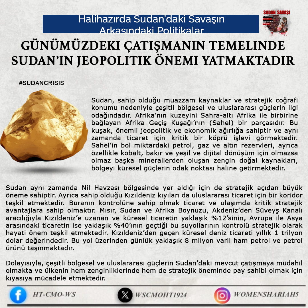 Sudan, altın, petrol ve diğer doğal kaynaklar açısından zengin bir ülkedir. Ayrıca, dünyanın en stratejik konumlarından birine sahiptir. Tüm bunlar, uzun zamandır birçok bölgesel ve uluslararası gücün dikkatini çekmiş ve bu güçler, Sudan'ın zengin kaynakları üzerinde hakimiyet ve kontrol sağlamak için rekabet etmektedir.