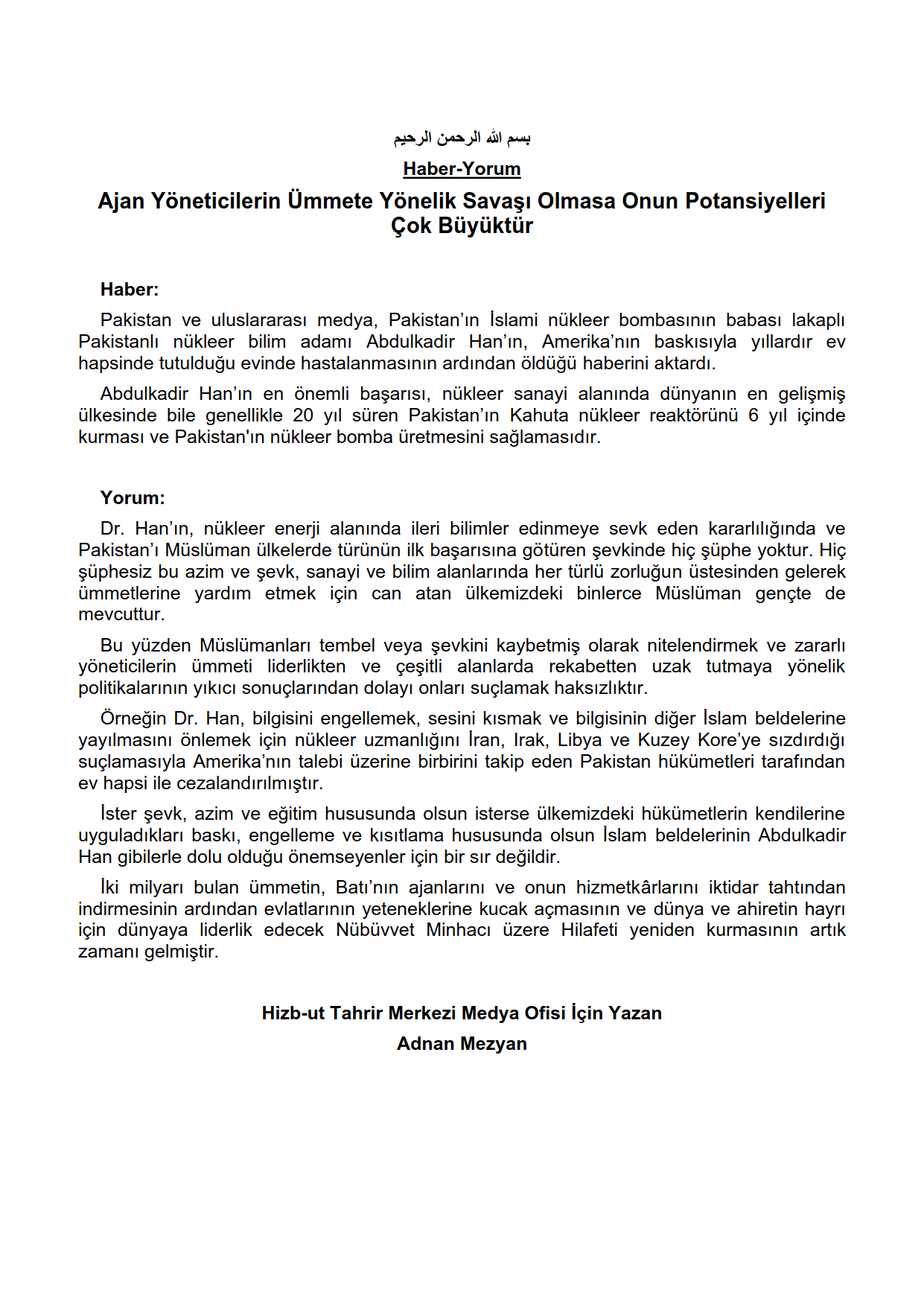 Pakistan ve uluslararası medya, Pakistan’ın İslami nükleer bombasının babası lakaplı Pakistanlı nükleer bilim adamı Abdulkadir Han’ın, Amerika’nın baskısıyla yıllardır ev hapsinde tutulduğu evinde hastalanmasının ardından öldüğü haberini aktardı.