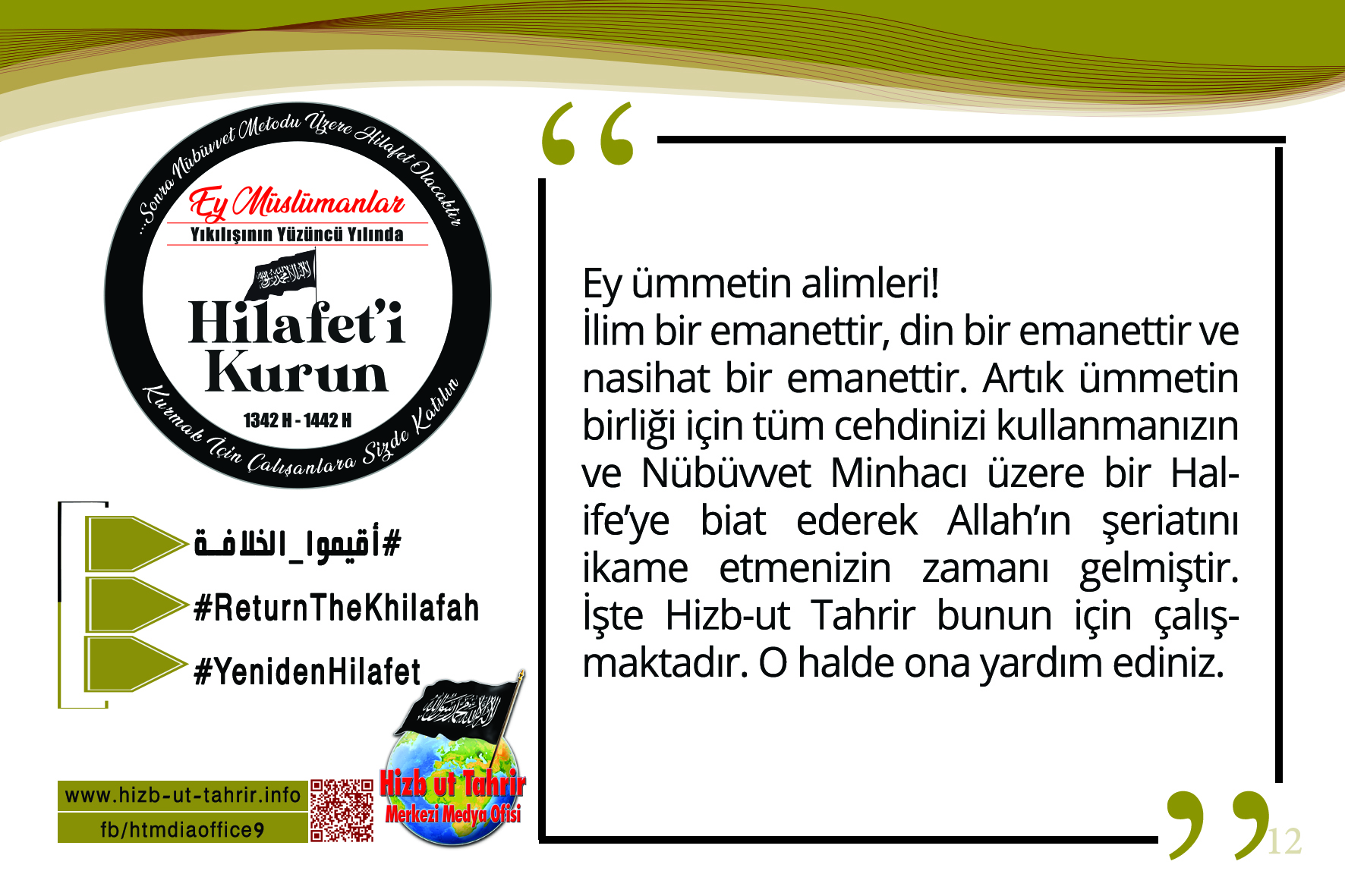 Hilafetin yıkılışının hüzünlü yıldönümü münasebetiyle Hizb-ut Tahrir'in başlattığı küresel kampanya kapsamında Dünya çapında 15'ten fazla dil konuşan 22'den fazla ülkeden 218 davetçinin müşterek çabasının İslam ümmetine tek bir mesajla çağrısı: