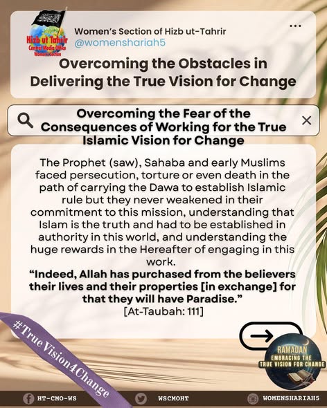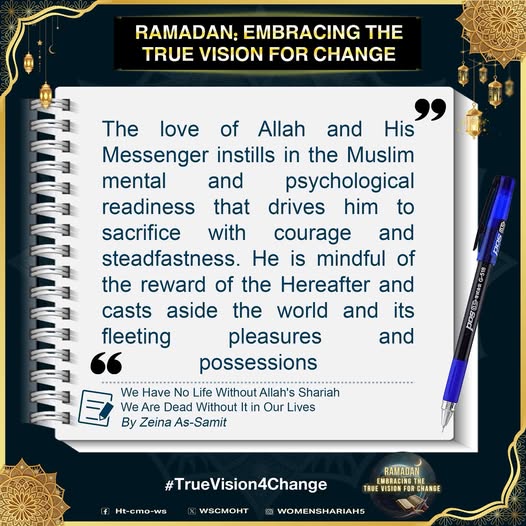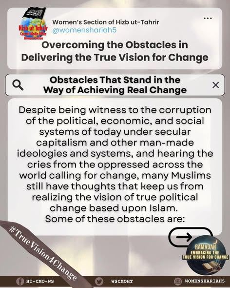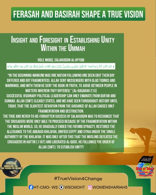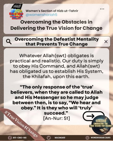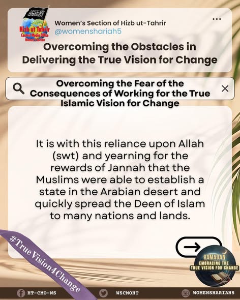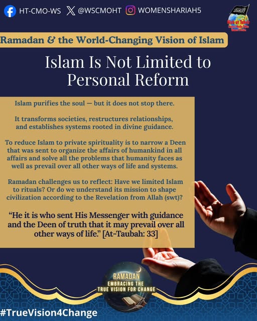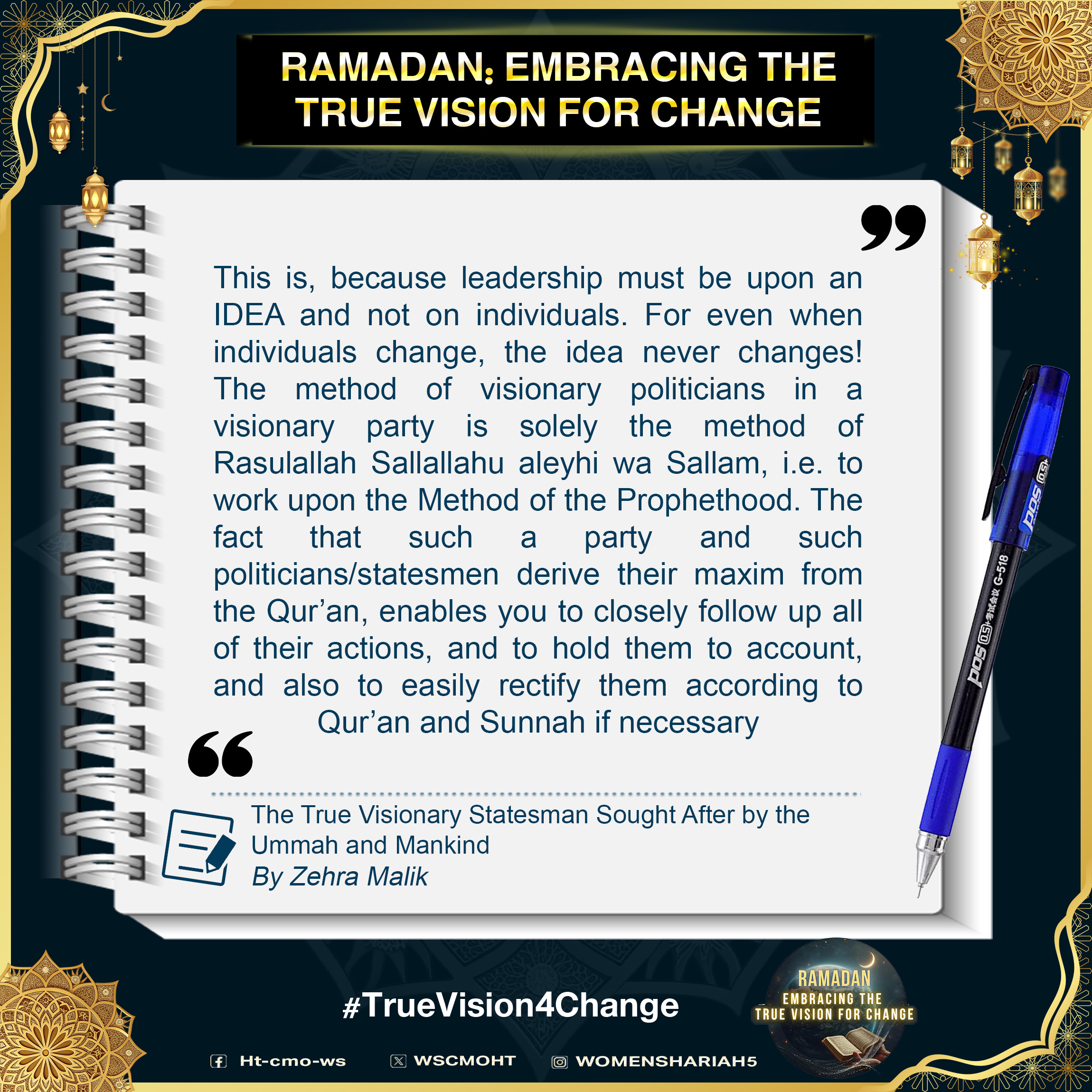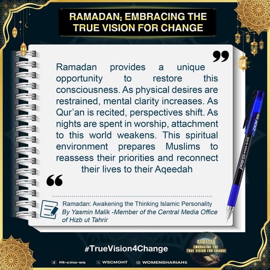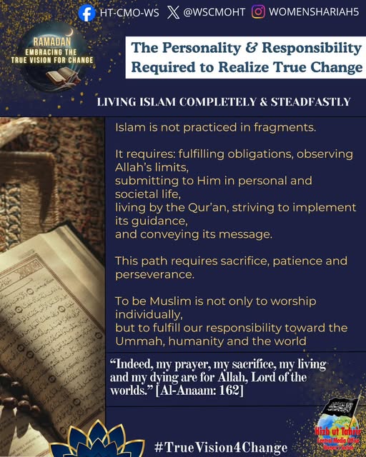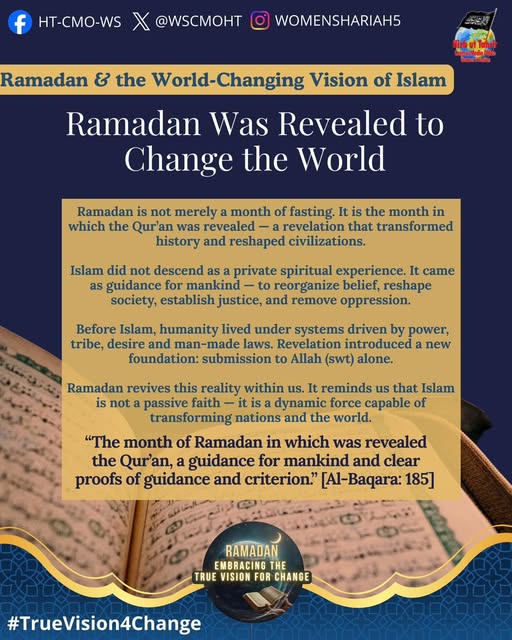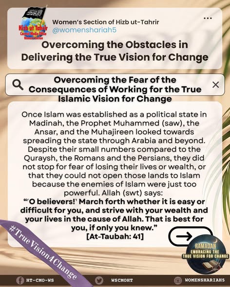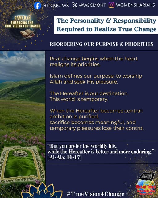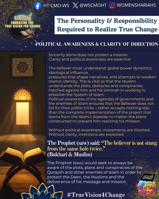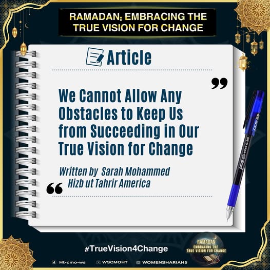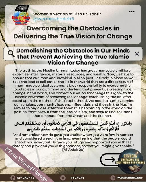 اس بابرکت مہینے میں، حزب التحریر کے مرکزی میڈیا آفس کا خواتین سیکشن اس موضوع پر خطاب کرے گا، جس میں بطور مسلمان، امت اسلامی، ہماری سیاسی جماعتوں، ہماری فوجوں اور ریاستی سطح پر تبدیلی کے اس حقیقی وژن کو حاصل کرنے کے لیے اپنے اندر ضروری خصوصیات اور تبدیلیاں شامل ہیں۔ یہ اس کے حصول کی راہ میں حائل رکاوٹوں اور ان پر قابو پانے کے طریقوں پر بھی بات کرے گا۔