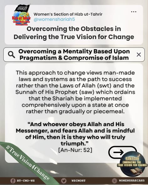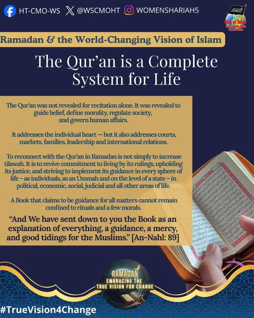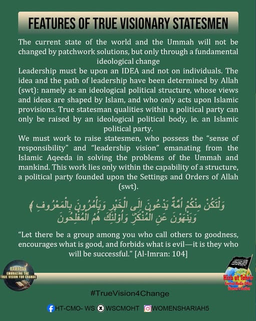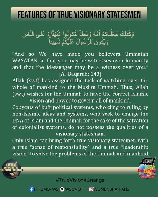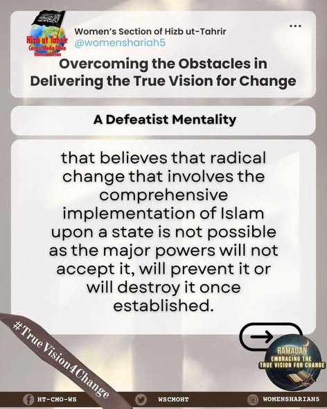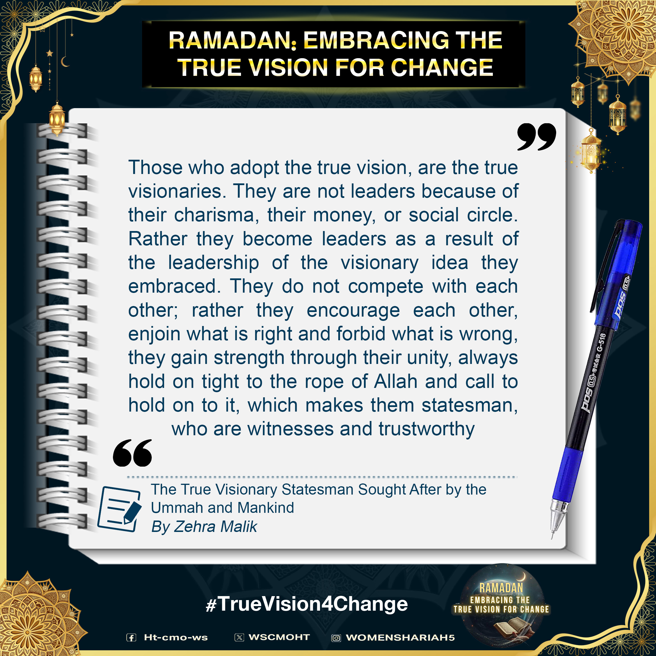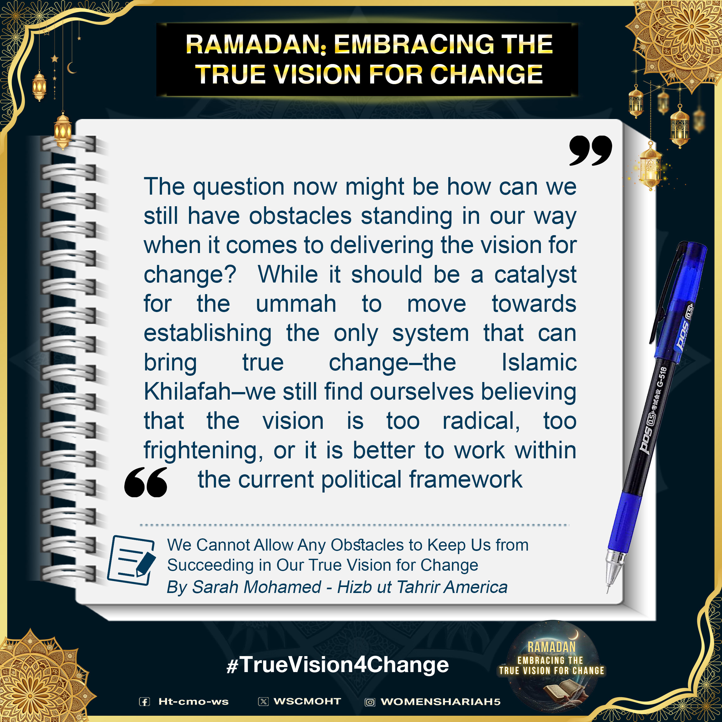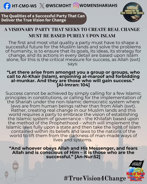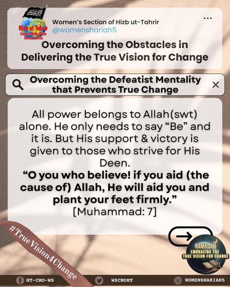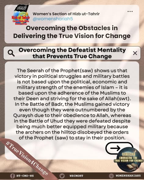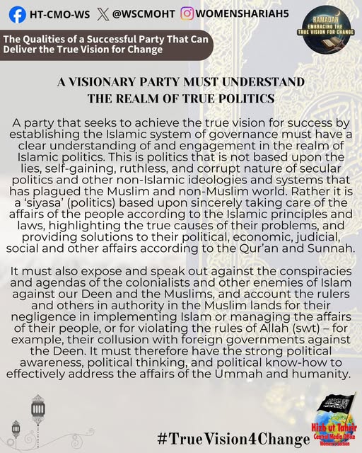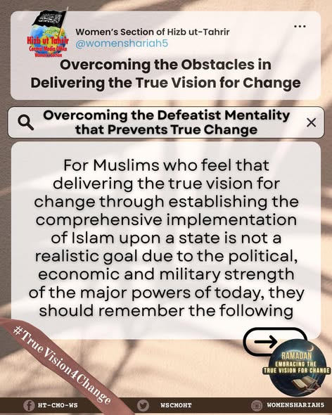 اس بابرکت مہینے میں، حزب التحریر کے مرکزی میڈیا آفس کا خواتین سیکشن اس موضوع پر خطاب کرے گا، جس میں بطور مسلمان، امت اسلامی، ہماری سیاسی جماعتوں، ہماری فوجوں اور ریاستی سطح پر تبدیلی کے اس حقیقی وژن کو حاصل کرنے کے لیے اپنے اندر ضروری خصوصیات اور تبدیلیاں شامل ہیں۔ یہ اس کے حصول کی راہ میں حائل رکاوٹوں اور ان پر قابو پانے کے طریقوں پر بھی بات کرے گا۔
