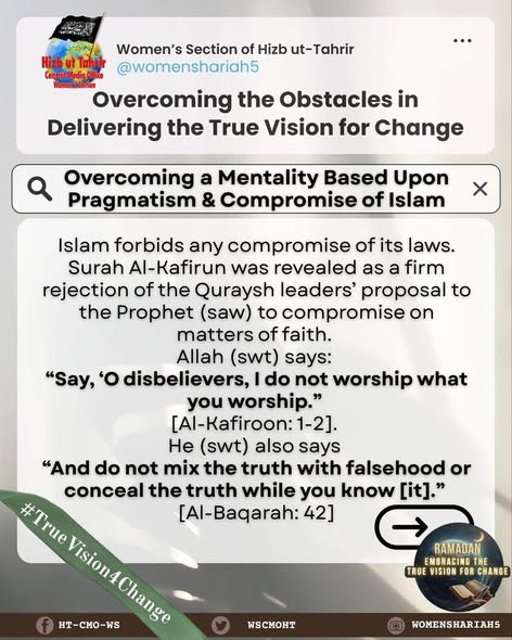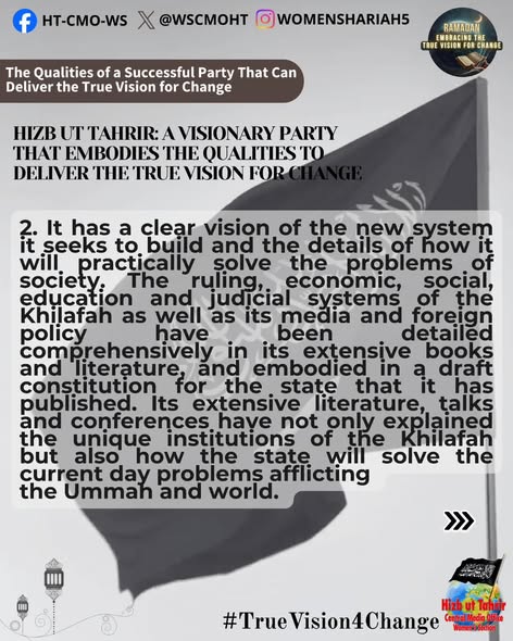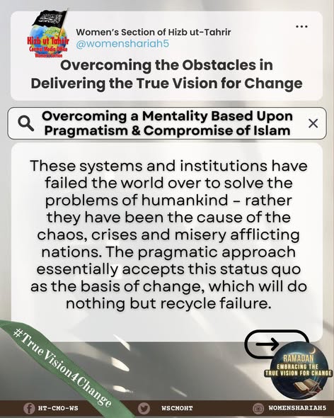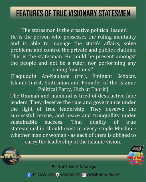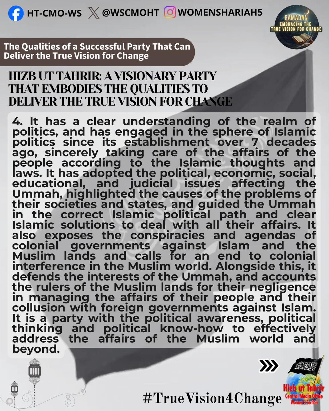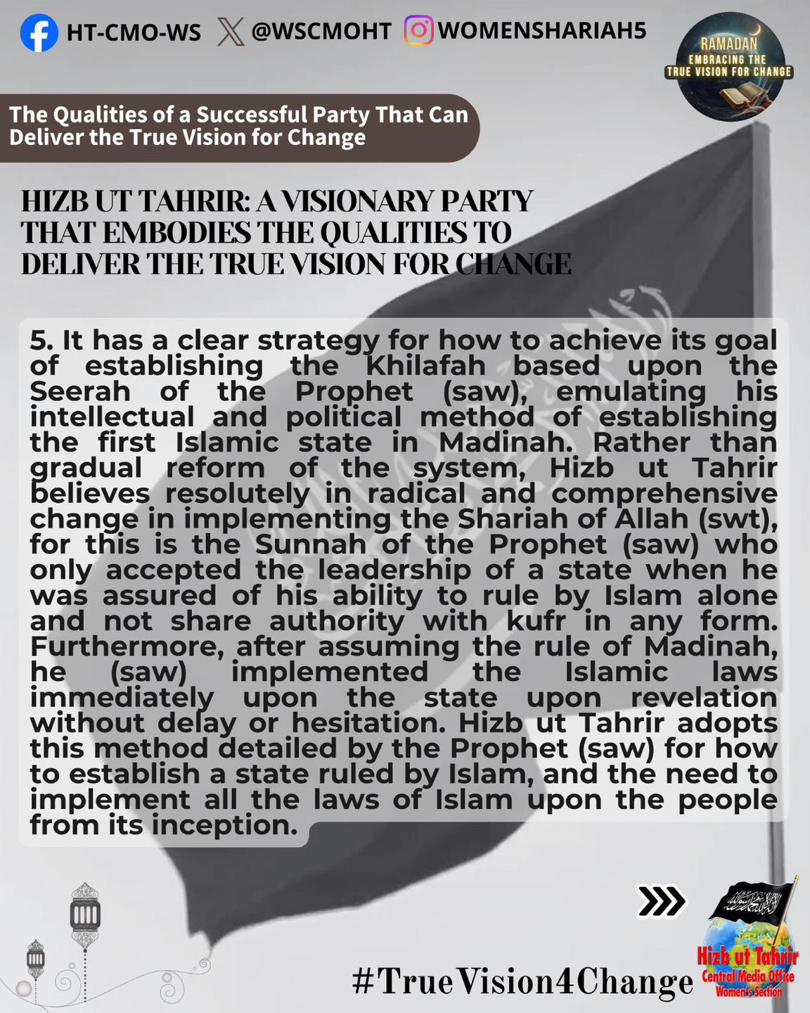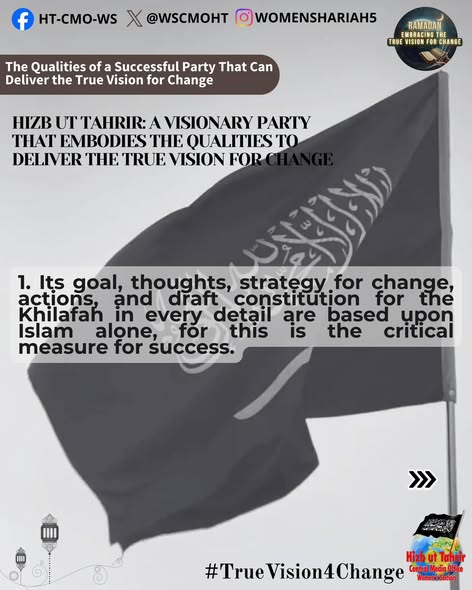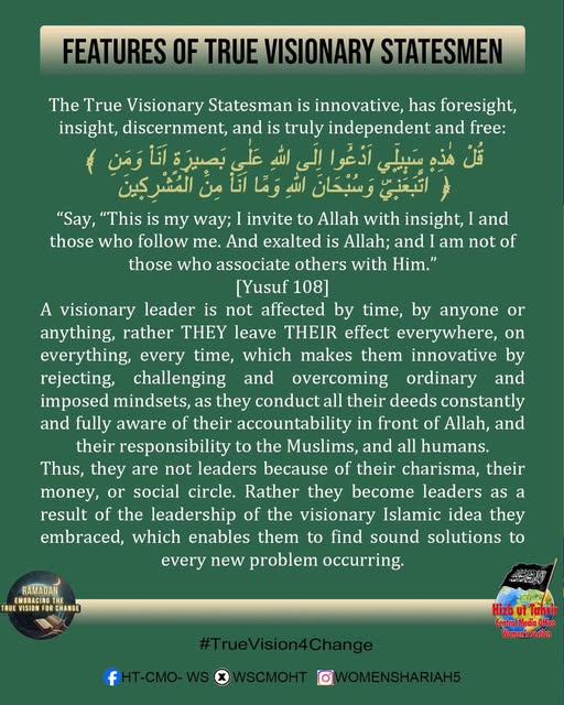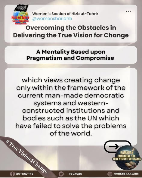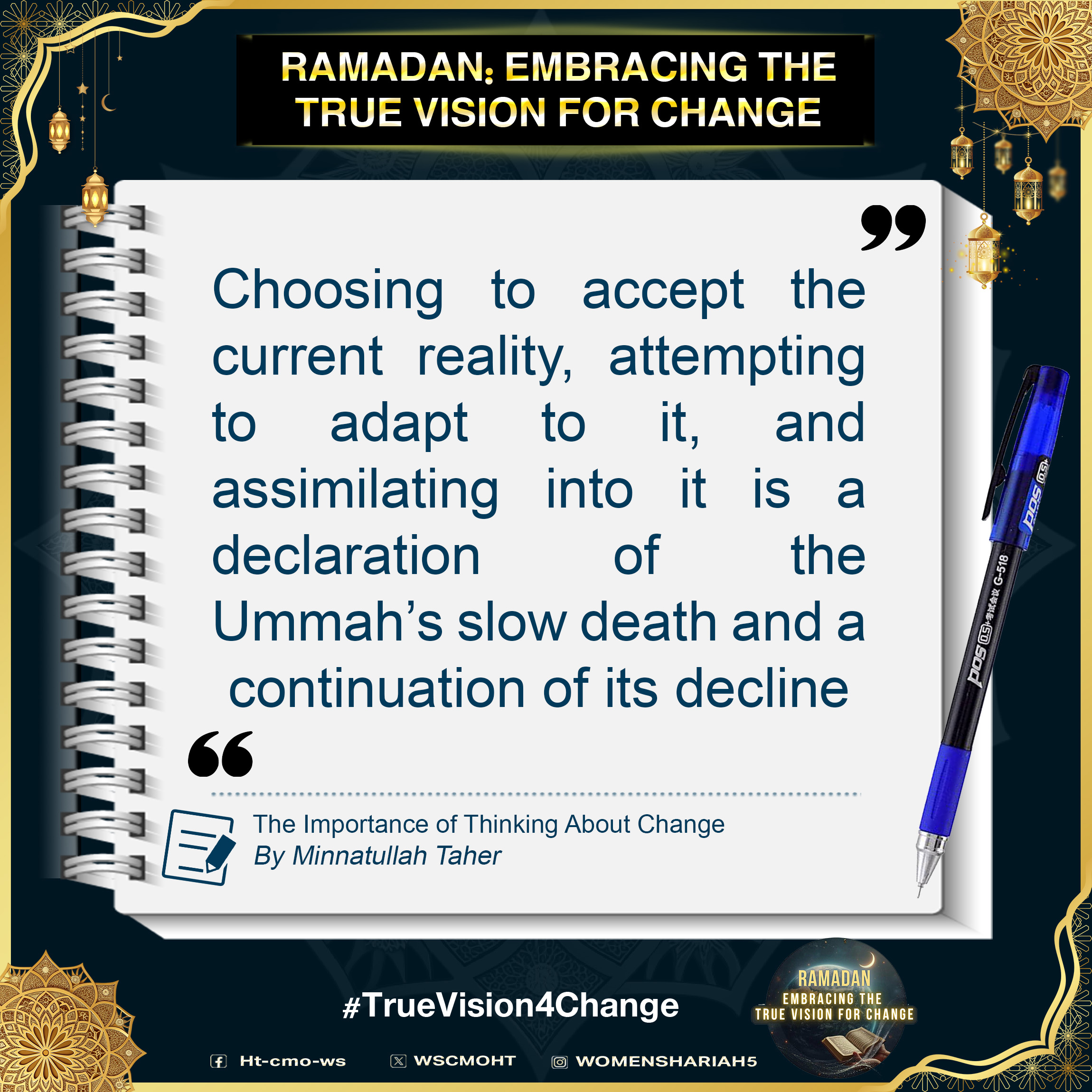 اس بابرکت مہینے میں، حزب التحریر کے مرکزی میڈیا آفس کا خواتین سیکشن اس موضوع پر خطاب کرے گا، جس میں بطور مسلمان، امت اسلامی، ہماری سیاسی جماعتوں، ہماری فوجوں اور ریاستی سطح پر تبدیلی کے اس حقیقی وژن کو حاصل کرنے کے لیے اپنے اندر ضروری خصوصیات اور تبدیلیاں شامل ہیں۔ یہ اس کے حصول کی راہ میں حائل رکاوٹوں اور ان پر قابو پانے کے طریقوں پر بھی بات کرے گا۔