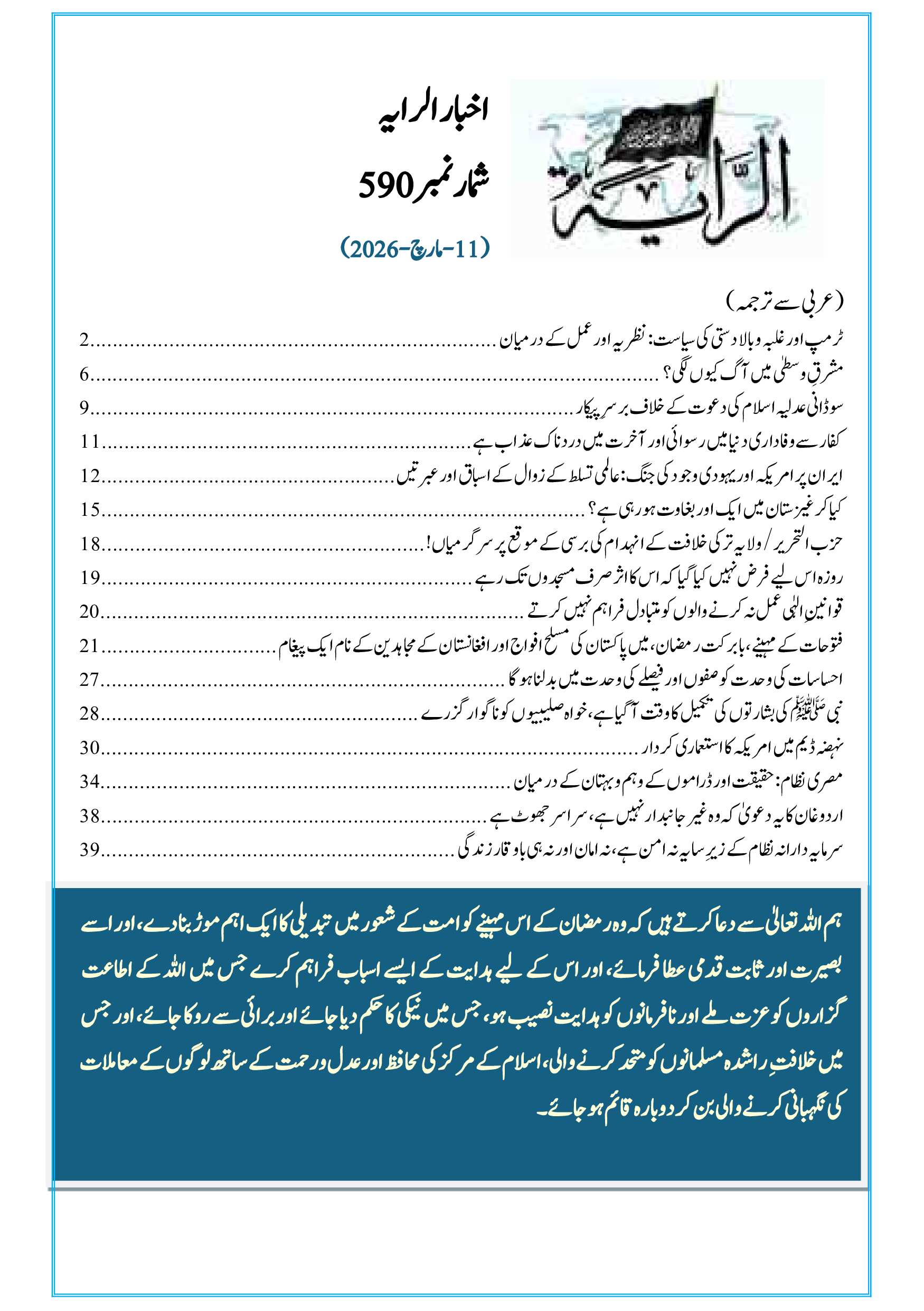 22 من رمــضان المبارك 1447هـ | بدھ, 11 مارچ 2026 سب سے پہلے تبصرہ کرنے والے بنیں فونٹ سائز فونٹ سائز گھٹائیں increase font size بسم الله الرحمن الرحيم رایہ اخبا ر شمارہ نمبر 590 ویب سائٹ پی ڈی ایف کے لئے: یہاں کلک کریں 22 رمضان 1447ھ - 11 مارچ 2026ء Last modified onبدھ, 11 مارچ 2026 19:43 Latest from ایران کے خلاف امریکہ کی جنگ کے اثرات الرایہ اخبار: شمارہ 595 کی نمایاں سرخیاں امت کے نوجوان: بکھری ہوئی توانائی سے خلافت قائم کرنے والی قوت تک امریکہ: بیرونی طاقت اور اندرونی انتشار کے درمیان امریکہ اور یہودی وجود کی ایران کے خلاف جنگ اور سوڈان پر اس کے اثرات More in this category: « رایہ اخبا ر شمارہ نمبر 589 رایہ اخبا ر شمارہ نمبر 591 » Leave a comment Make sure you enter the (*) required information where indicated. HTML code is not allowed. Name * ای میل * Website URL Enter the two words you see below Message * آپ کا پیغام یہاں درج کریں ... اوپر کی طرف جائیں