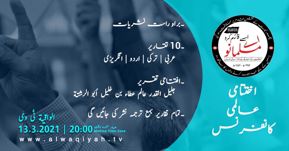 ان شاء اللہ، "خلافت کے انہدام کے 100 سال مکمل ہونے پر۔۔۔ اے مسلمانوں اسے دوبارہ قائم کرو" کی مہم کے اختتام پر حزب التحریر ایک عالمی کانفرنس منعقد کرے گی جسے الواقعہ ٹی وی کے ذریعے 29 رجب 1442 ہجری، بمطابق 13 فروری 2021 بروز ہفتہ براڈکاسٹ کیا جائے گا۔ اس براڈکاسٹ میں آپ بھی شامل ہوں اور اس پیغام کو اللہ کی رضا کے لیے آگے بھی پہنچائیں کیونکہ اللہ اُس وقت تک اپنے بندے کا حامی و ناصر ہوتا ہے کہ جب تک وہ اپنے مسلمان بھائی کی مدد کرتا رہے۔